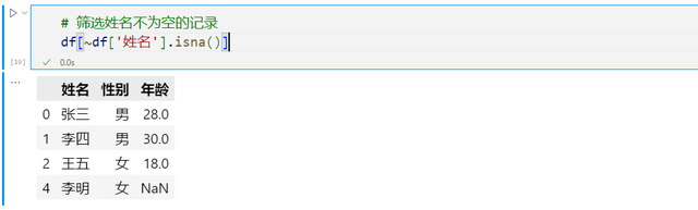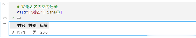 isna方法可以检测某个单元格是否为空值,使用它可以方便地筛选出指定列缺失的数据,以及反数据