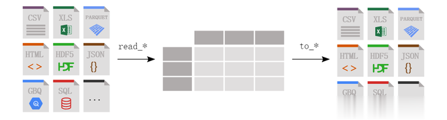 读取excel文件首先需要说明pandas支持的远不止excel这一个类型,它可以读取和写入下图所示的多种类型的数据格式,这里重点以excel为例进行讲解。
