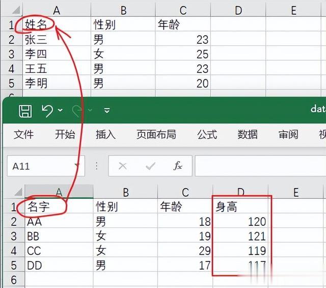数据的合并在数据的过滤和清洗示例中,我们给出了excel文件中瑕疵数据的各种处理手段,还可能存在一份完整的原始数据需要从很多表格中汇总的情况。再次构造两个包含员工的信息excel文件,仔细观察会发现两个表格中姓名和名字是相同的意思,其中一个表格还多了身高这一列,也就是说这两个表格数据并不完全一致,如果这样的表非常多,合并起来岂不是头大,说不定会边干活边爆粗口。