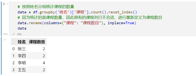 结合groupby和count方法,按照姓名进行分组可以统计学生考试课程的数目,count对课程进行计数