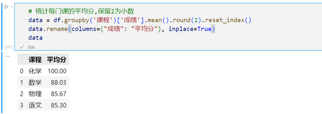 结合groupby和mean方法,按照课程进行分组可以统计每门课程的平均分,mean对成绩一列求平均值