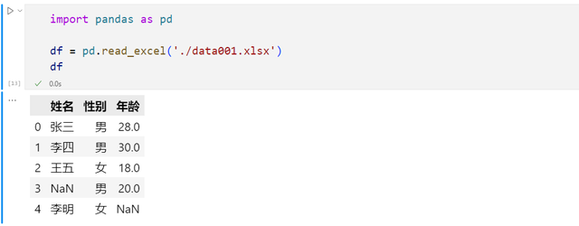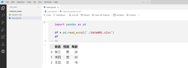 # 导入pandas模块,简写为pdimport pandas as pddf = pd.read_excel('./data001.xlsx')df读取当前目录下的excel文件并显示表格数据,这里展示了jupyter文件的后缀和相关文件目录结构,后面将主要展示代码和数据部分。