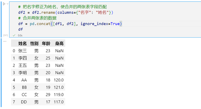 接下来,首先需要做的就是把姓名和名字这两个字段名称统一,将名字改为姓名,然后使用pd.concat就可以把所有读取到的excel数据的列表进行合并了。合并结果如下,不包含身高信息的员工身高一列被填充为空,还需要强调的是合并的表格列名顺序不必一致,只要相同名称就可以正确合并,这就是pandas的强大之处。