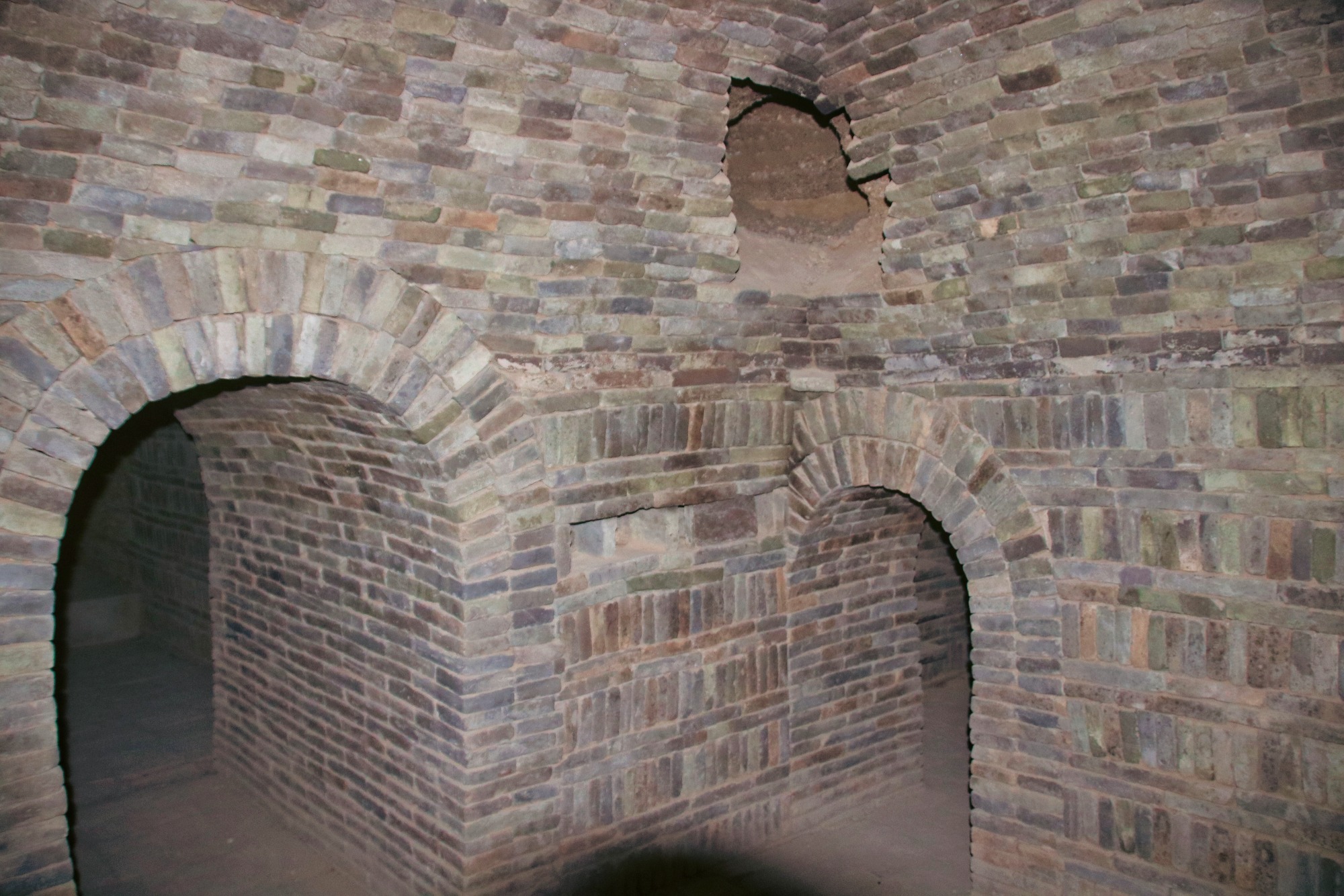抬头可见青砖垒砌的拱门墓壁,这些青砖纵横交错,缝隙间完全没有粘合剂却能历经千年而不塌,如此坚固凭借的就是古代匠人对力学的精通和运用。