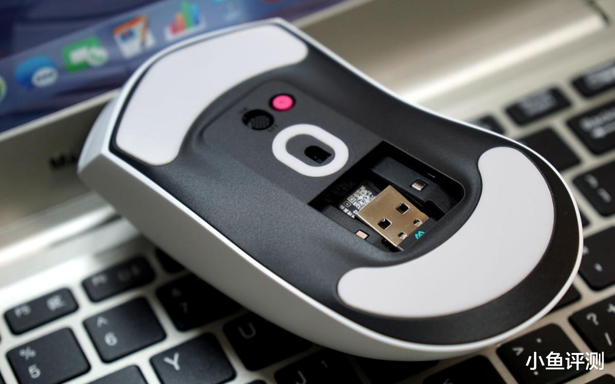 底部那个隐藏式的nano接收器收纳仓要点个赞,非常小,19x13x5mm的尺寸,插在电脑上几乎可以忘掉它的存在。而且这个小接收器还有指示灯,能看电量和DPI档位,这个设计很直观,不用打开驱动就能知道状态。