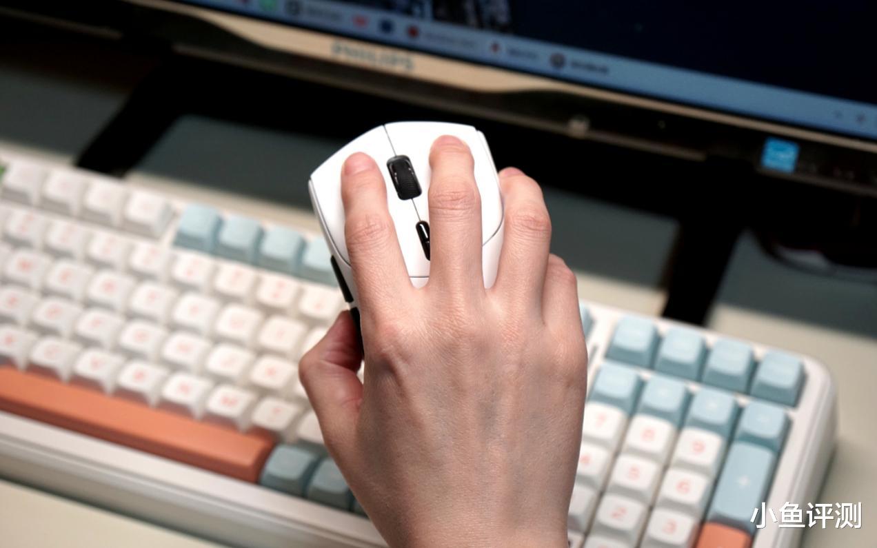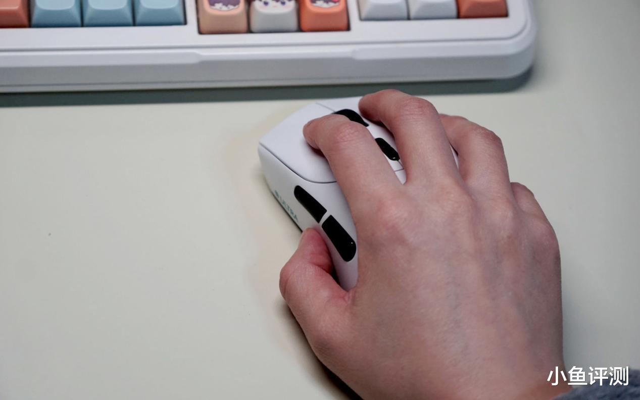 开箱第一印象,就是“轻”。上手掂量了一下,确实符合官方说的约53g这个范畴。我拿到的这个是皎月白配色,全身亲肤防滑涂层,没有那种亮面的大塑料感。虽然是个纯右手型鼠标,但它的对称设计很巧妙,握上去掌心有支撑,但又不会顶得太满,对于中大手的趴握和抓握来说,都能找到一个挺舒服的姿势。
