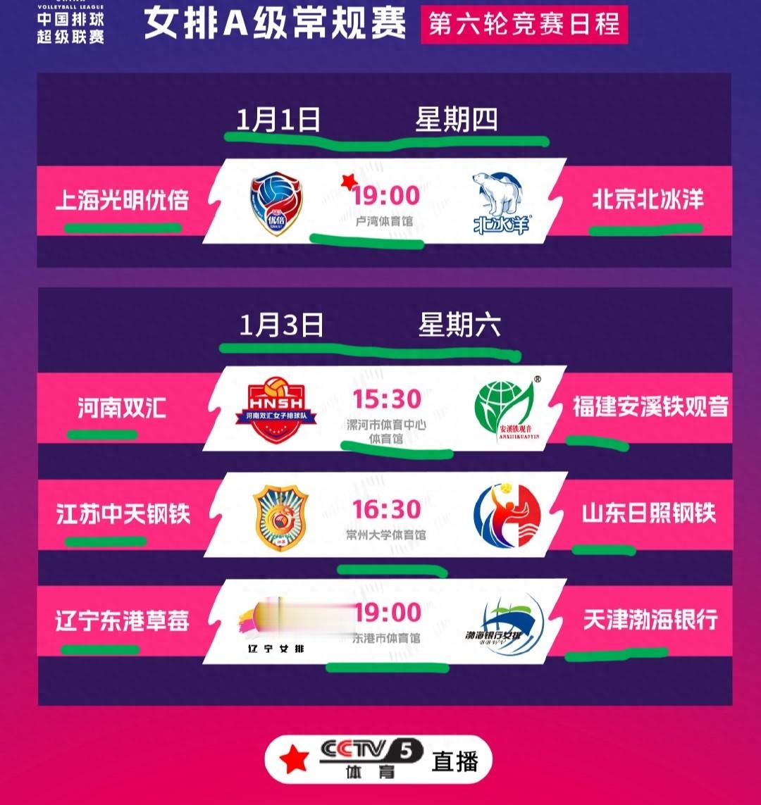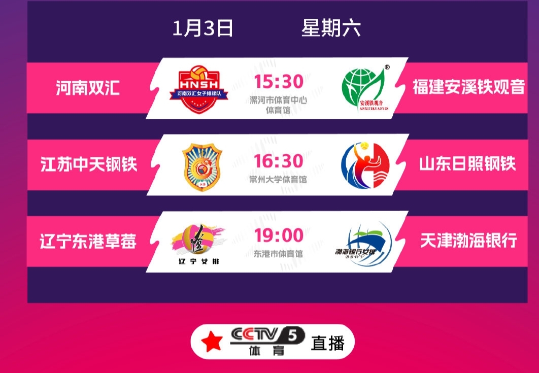 第六轮比赛的另外三场比赛安排在1月3号周六。1月3号下午三点半,河南女排对阵福建女排。两支队伍都是一胜战绩实力相当,本场比赛河南女排和福建女排都渴望拿下第二场比赛的胜利。