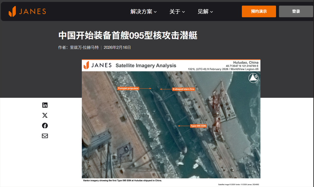 2月16日,简氏防务周刊网站也对095型攻击核潜艇进行了报道,打出的标题就很是引人眼球——《中国开始装备首艘095型核攻击潜艇》,中国的军事博主对此纷纷予以转载或点评。