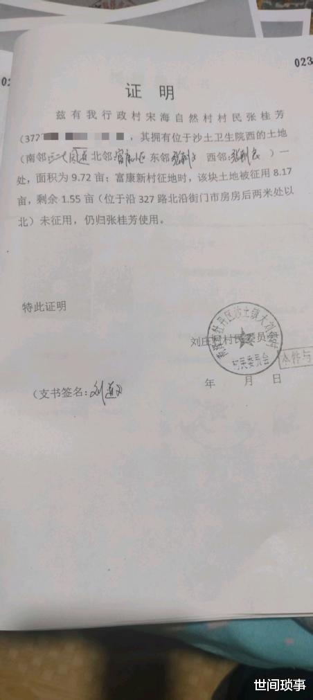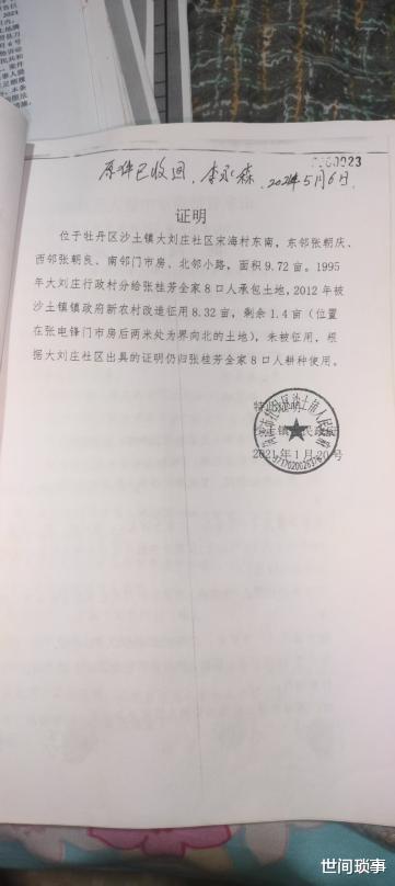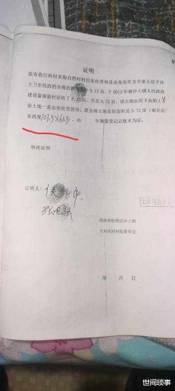 其一,村委会为张桂芳出具多份矛盾证明,且存在明显虚假,土地权属及征收事实表述相悖,是导致本案陷入诉讼深渊的核心原因。2020年7月,村委会曾证明张桂芳家8.32亩土地已全部被征收,后又出具证明称其拥有9.72亩土地,其中1.55亩未被征收且包含案涉地块。更关键的是,村委会还为张桂芳的邻居出具了虚假证明,以此启动诉讼程序。 但据74.53亩征收土地勘测图显示,该地块四至边界为东接沙土中心医院墙、南邻门市房后墙、西靠大路、北临大路,且土地东边实际测量尺寸为90多米,与村委会声称的107.5米长度存在巨大差距,实测面积与缺口面积合计无误差,且勘测图标注的土地尺寸根本无法形成9.72亩的面积。村委会出具的证明缺乏勘测数据支撑,内容虚假,真实性存疑,直接误导了后续的行政与司法程序。