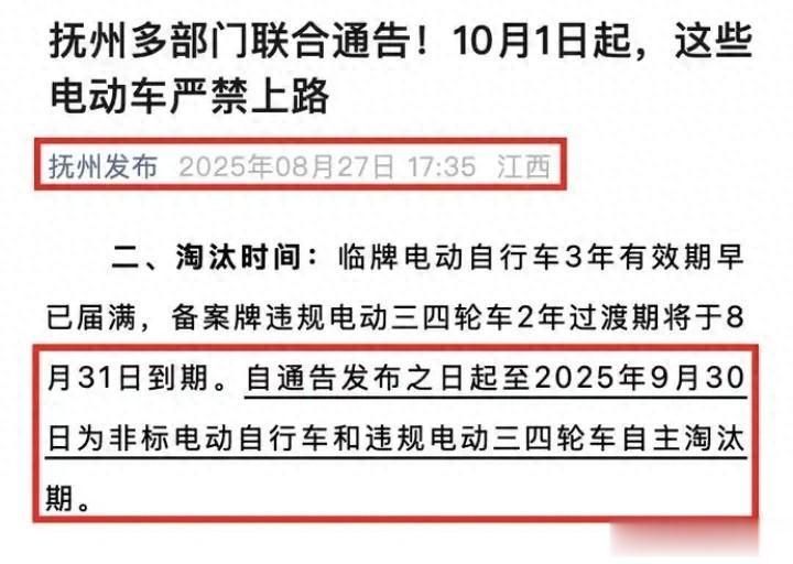 2025年10月1日江西抚州,所有悬挂临时牌照的两轮电动车、三轮电动车、以及未备案登记上牌的电动车将禁止上路行驶,违规上路被交通管理部门查到可能将面临扣车的处罚。