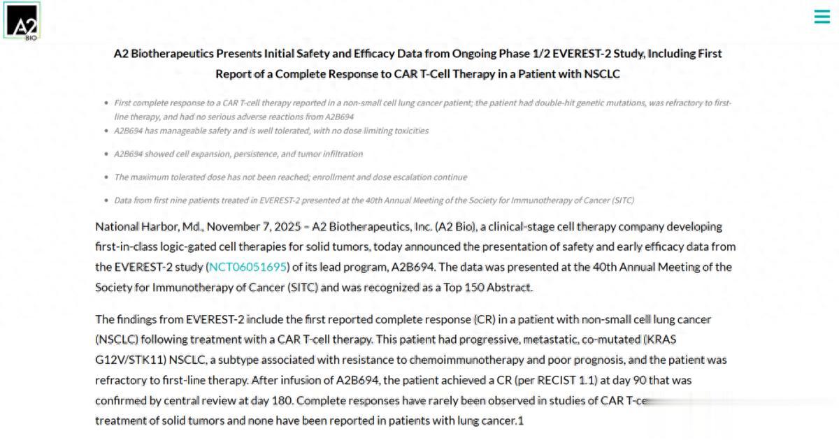 2025年11月7日,在SITC年会上,A2 Biotherapeutics公布的一份报告显示,一位被判定“预后极差”的晚期肺癌患者,在接受创新CAR-T细胞疗法后,体内肿瘤竟完全消失,成为全球首位通过该疗法实现肺癌肿瘤完全缓解的患者。