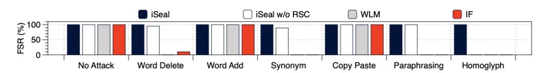 针对同义词替换、句式改写和 LLM 派生润色等篡改方式,iSeal 的相似度验证与纠错机制依然能够从潜在语义中识别指纹信号,因此验证成功率仍然维持在 100%。相比之下,基于精确匹配(Exact Match)的传统方法在此类攻击下完全失效。