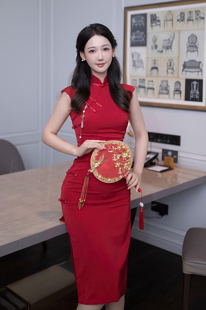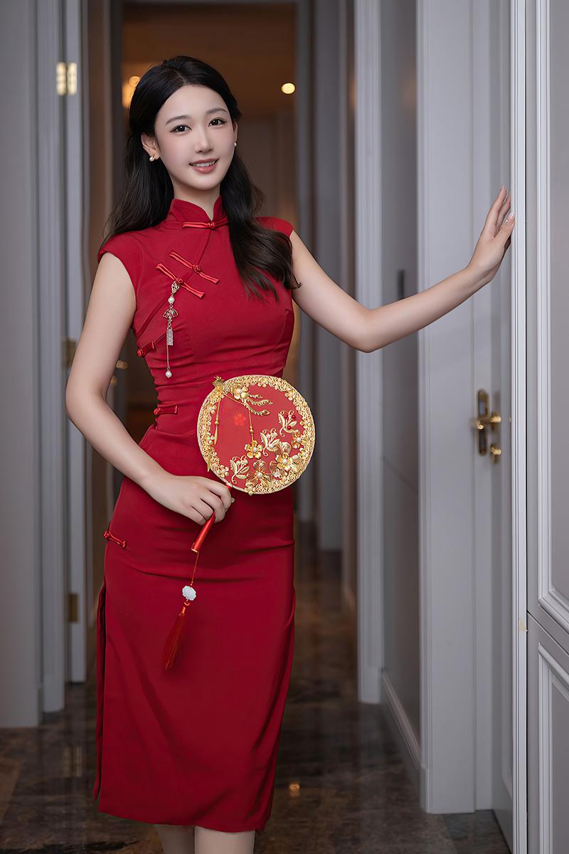 这身旗袍以正红色为主色调,视觉冲击力极强。领口的盘扣、侧边的开叉,每一处细节都彰显着旗袍的经典设计。而唐安琪的窈窕身段,让这件旗袍更具生命力,行走间,裙摆摇曳,身姿窈窕,仿佛一幅流动的复古画卷。她搭配的红色高跟鞋,与旗袍颜色相呼应,鞋面上的装饰又为整体造型增添了一丝精致感,整个穿搭的协调性满分。