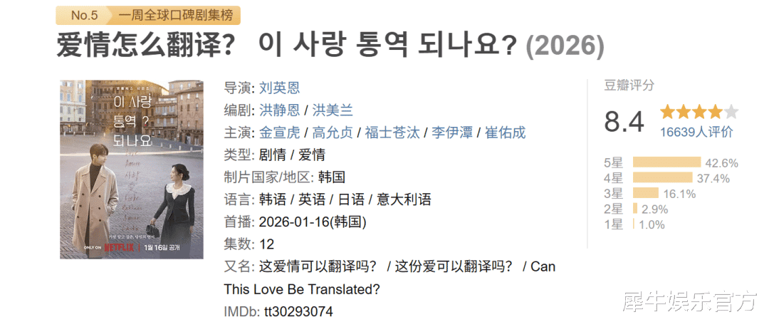 由Netflix出品的12集韩国爱情喜剧《爱情怎么翻译?》自1月16日上线后豆瓣评分从开分的7.8一路上涨至目前的8.4分,并一度登顶豆瓣热门剧集榜TOP1;全网热度同样瞩目,不但持续在韩国本土霸榜,还进入多个国家和地区播放榜前列;两位主演金宣虎、高胤祯的人气亦随着剧集播出与日俱增,社交平台均已涨粉超60万。