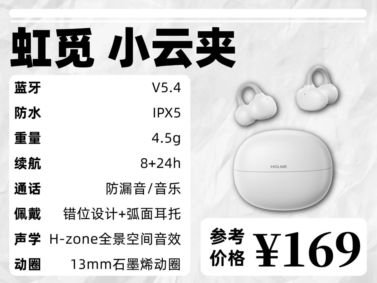 1、虹觅(HOLME)是 2019 年成立、专注开放式声学的国产品牌,秉持 “实在一点、去概念无套路” 的理念,主打高性价比与实用体验。