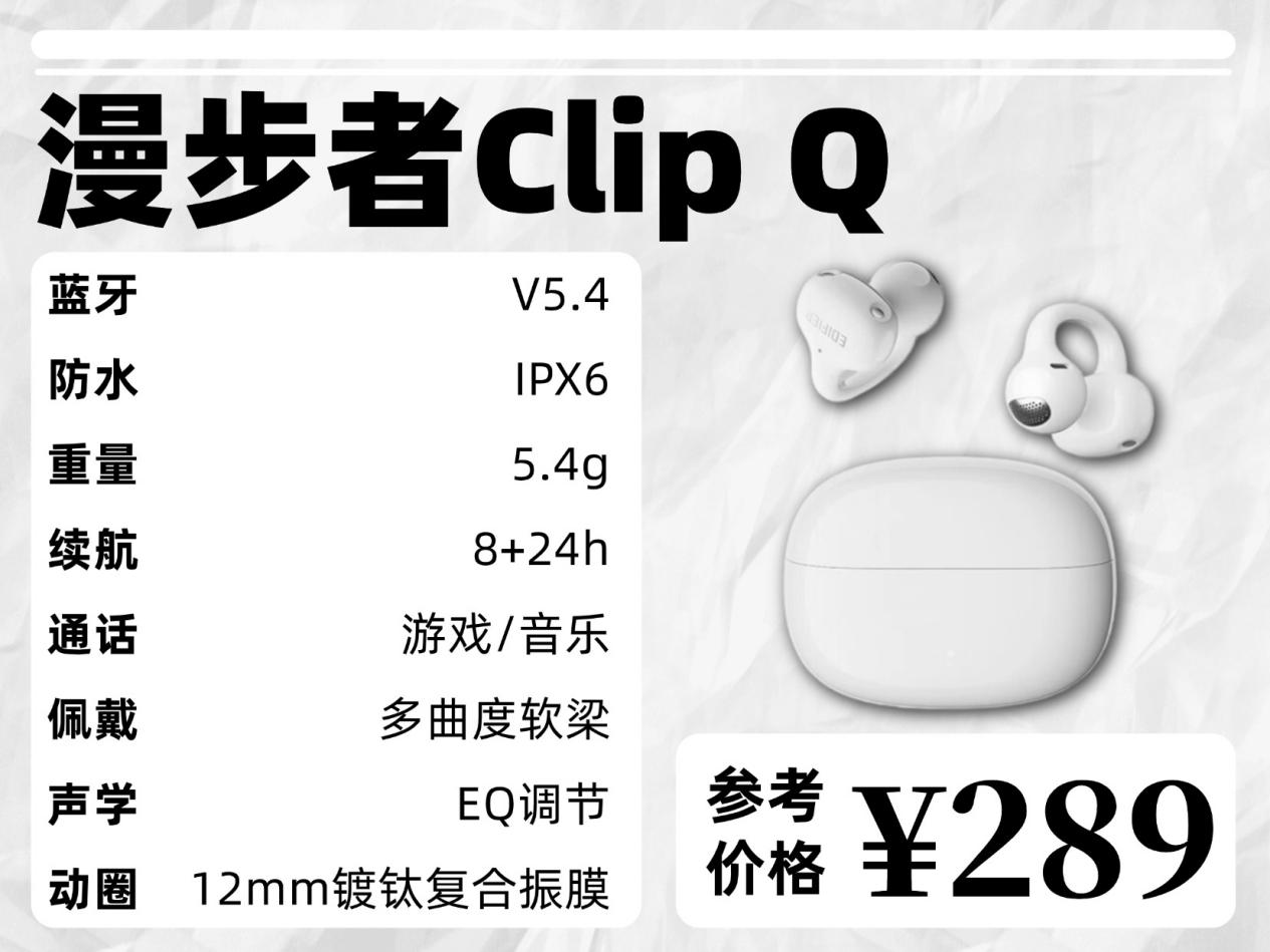 漫步者Comfo Clip Q:这款耳机采用 12 度黄金夹角搭配 C 形桥的设计,C 形桥内部嵌有超细镍钛记忆钢丝,外部则包裹亲肤 TPU 材质,既能自适应不同耳型,久戴也不会产生疼痛感,但是单耳 6.3g 的重量,相比同类产品略感偏重。