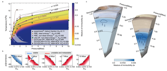 研究极端条件下的氢氦混合物特性及动力学行为是揭示生命起源、宇宙演化的重要基础,也是惯性约束聚变、武器库存与爆炸毁伤等国家战略的重要支撑。以气态巨行星如木星和土星为背景,氢氦不混溶性是行星物理中的关键参数,其相分离边界对精准评估行星的结构和演化至关重要。近日,国防科技大学理学院戴佳钰教授团队通过机器学习加速分子动力学模拟,揭示了在木星和土星内部极端温度和压力条件下氢氦混合物的相分离行为。研究团队针对混合体系发展了宽温压区间机器学习势函数,结合条件概率方法与基于Jarzynski不等式的非平衡自由能计算手段,给出了第一性原理精度的H/He分层热力学相图,得到了木星和土星内部氦雨分布区域半径,显著修正了原有的行星模型,为解释木星和土星大气中氦含量的降低提供了新视角。