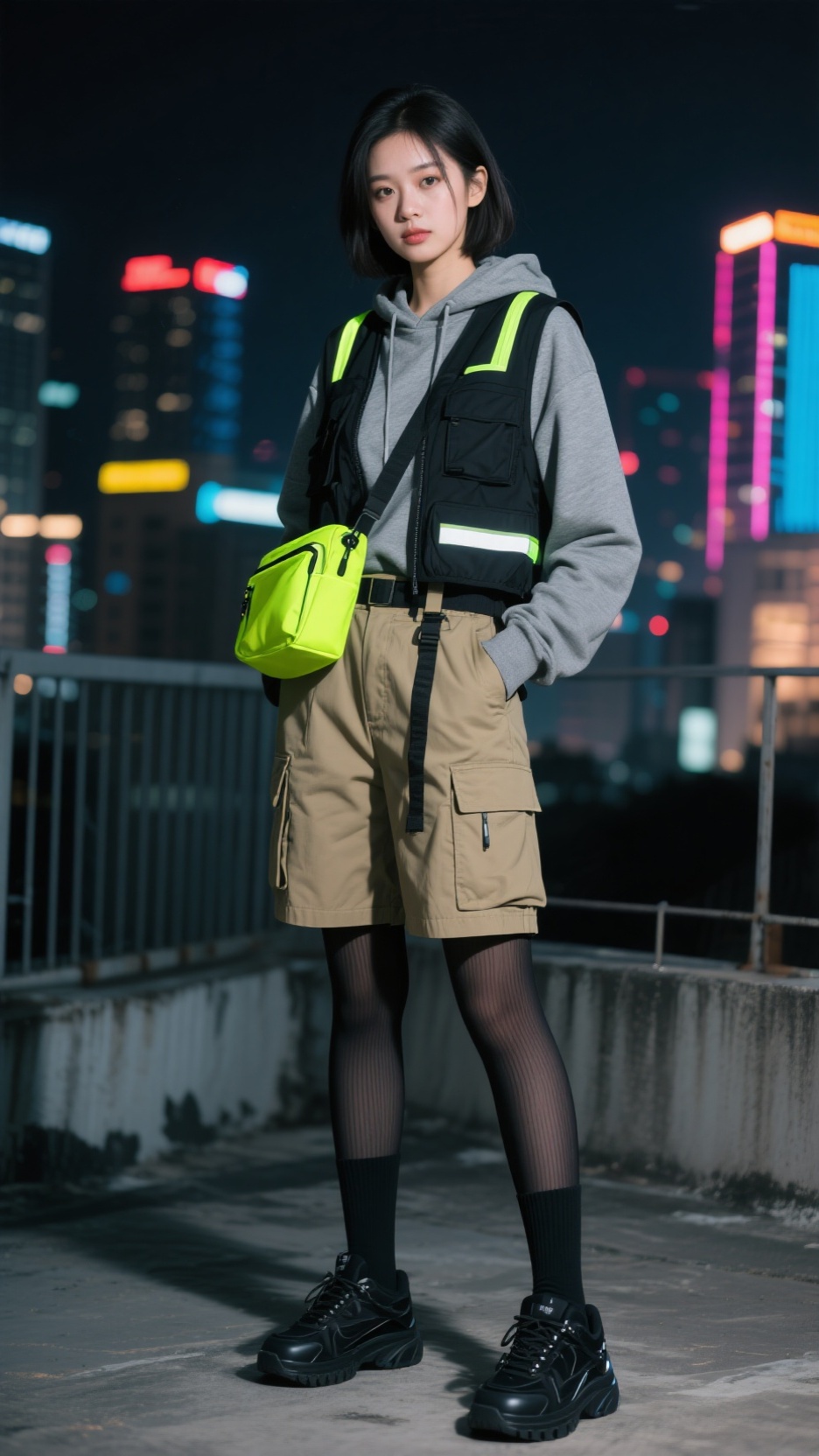 黑色工装马甲+灰色速干材质卫衣+卡其色工装短裤+竖向纹理哑光黑丝+黑色科技感厚底老爹鞋+黑色运动袜
