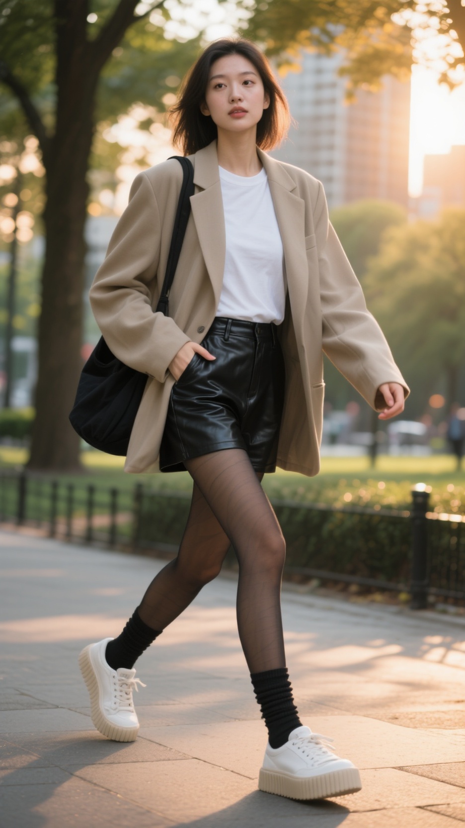 解读: 西装或大衣的硬朗和正式感,可以有效压制黑丝可能带来的过度性感。内搭短裤或短裙露出腿部线条,再用运动鞋注入休闲活力。这是最经典、最不容易出错的搭配。