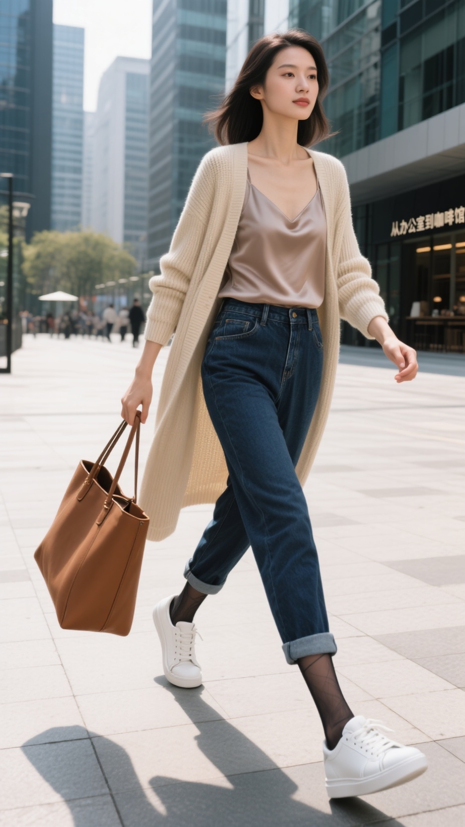 浅米色针织开衫+丝质吊带+深蓝色牛仔九分裤+超薄透肉微光泽黑丝+纯白色的皮质极简运动鞋+焦糖色托特包