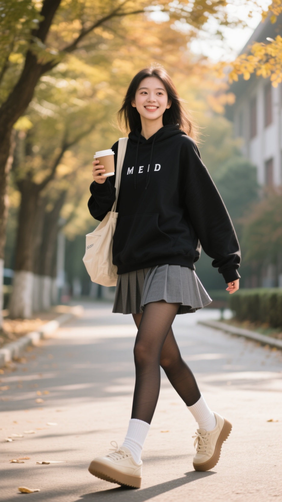 黑色丝袜+厚底复古运动鞋+堆堆袜+灰色百褶裙+Oversize卫衣