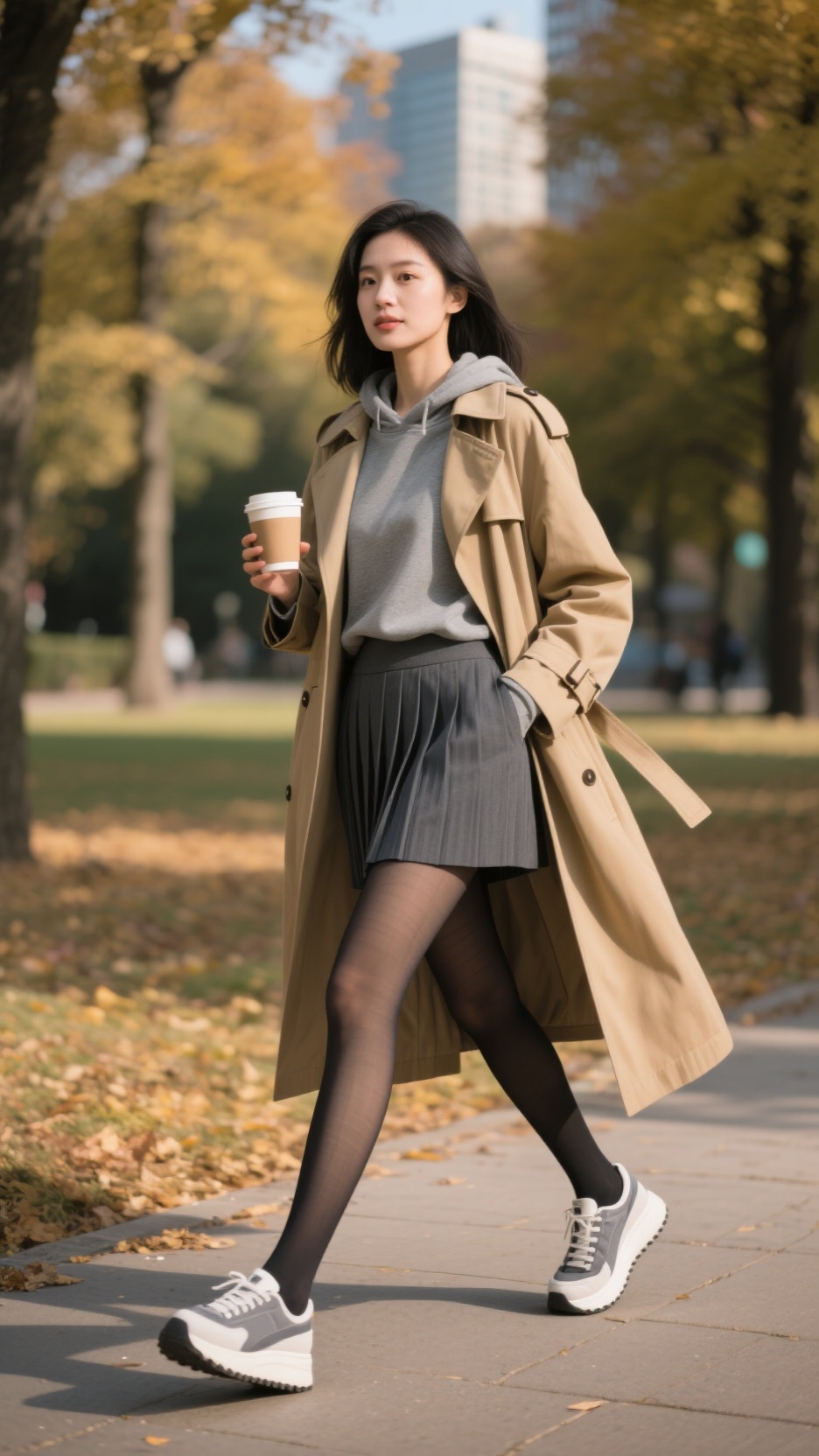 卡其色长款风衣+灰色卫衣+石墨灰色的百褶短裙+超薄透肉的哑光黑丝+厚底复古跑鞋