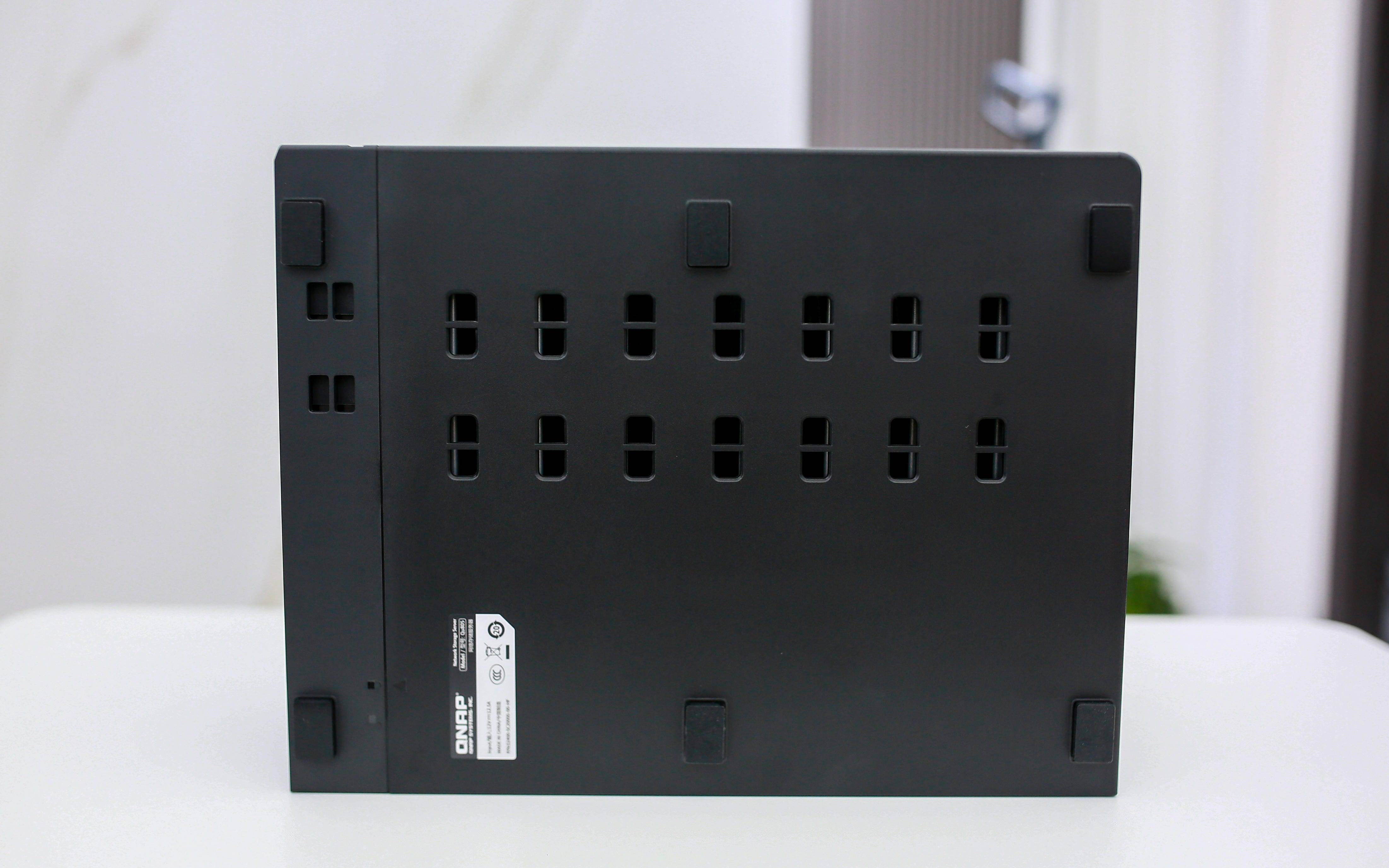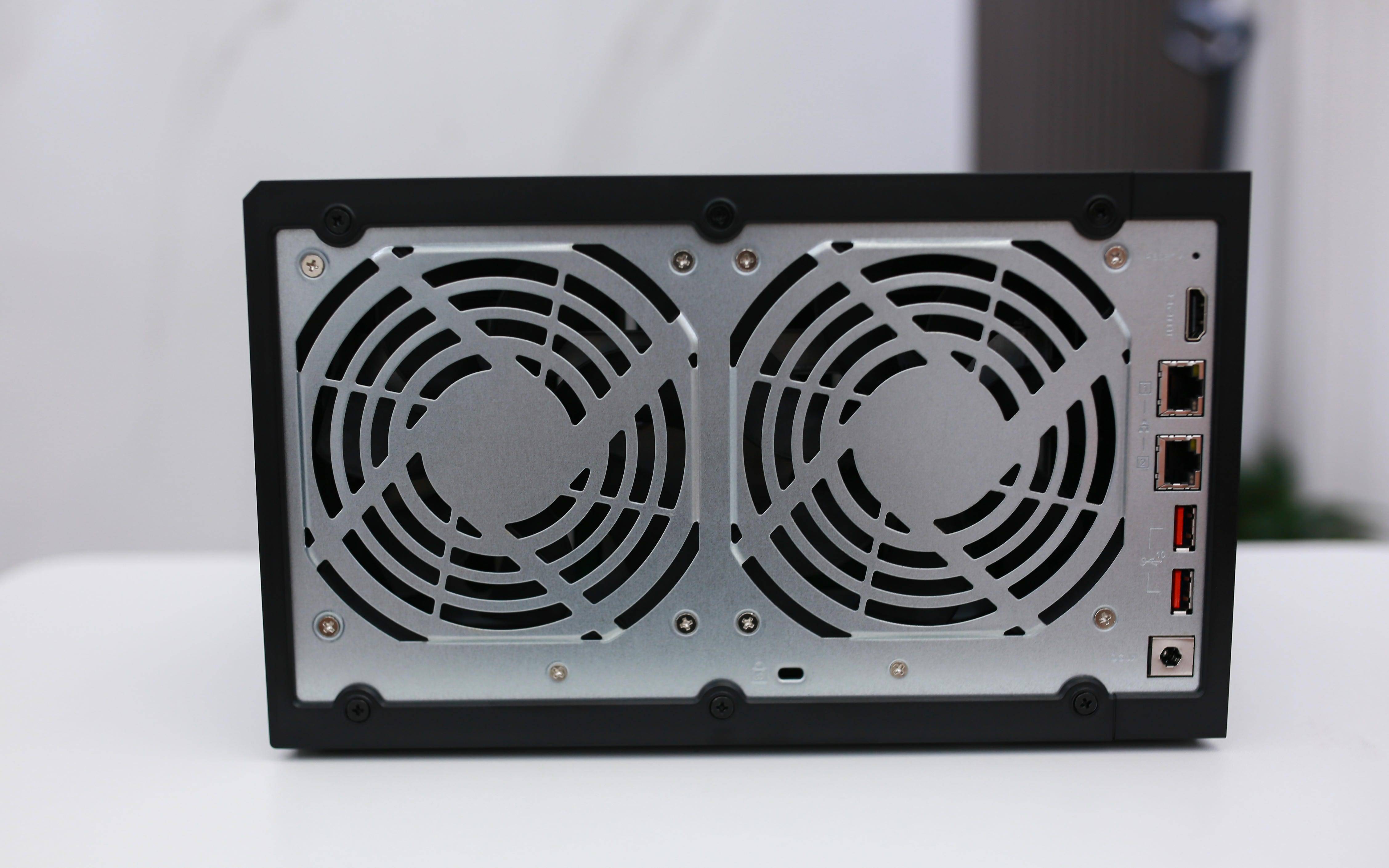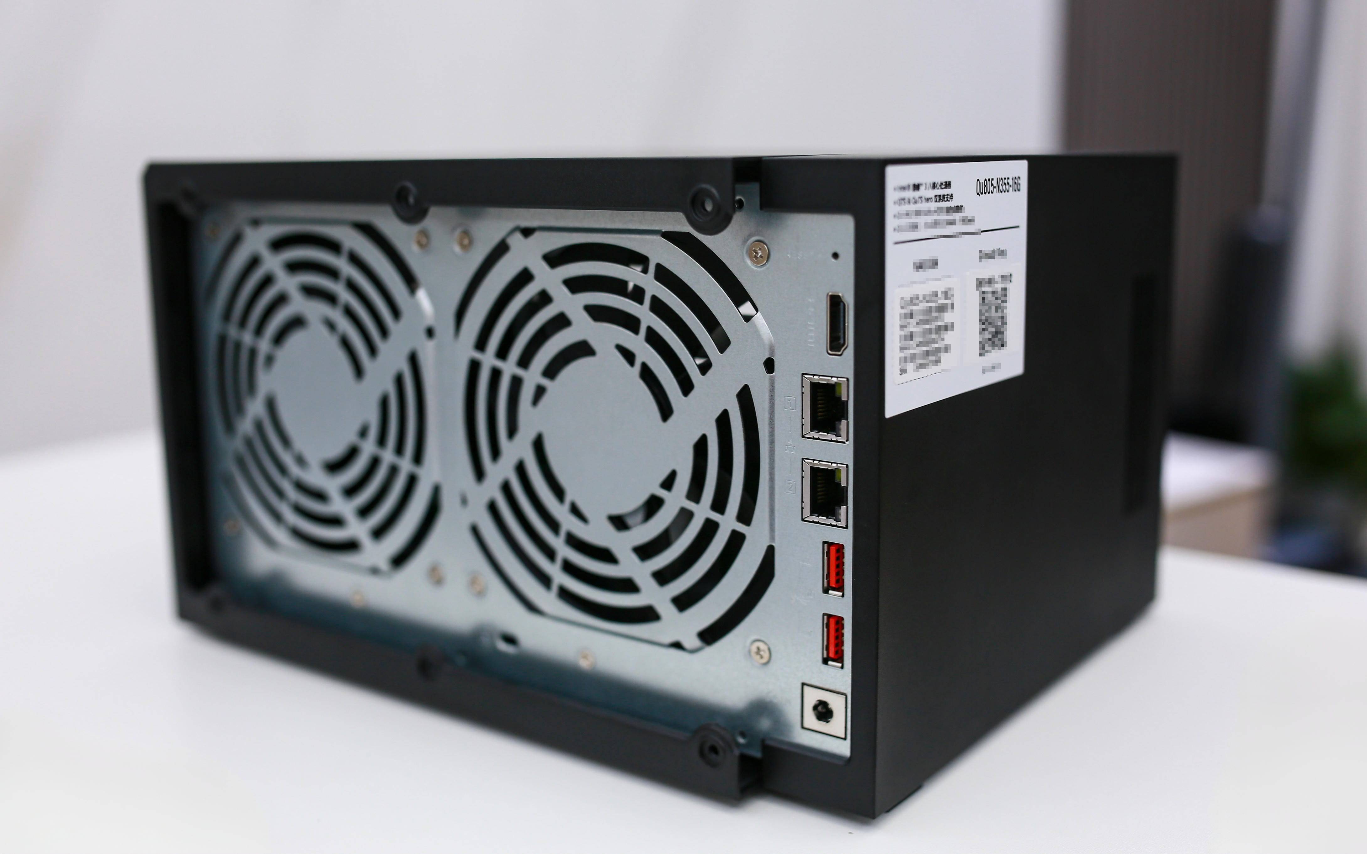 从背面看,QNAP LOGO 若隐若现,低调而有质感。两枚硕大的风扇占据主要空间,形成前进风、后出风的高效散热通道,保证多盘运行时温度稳定。