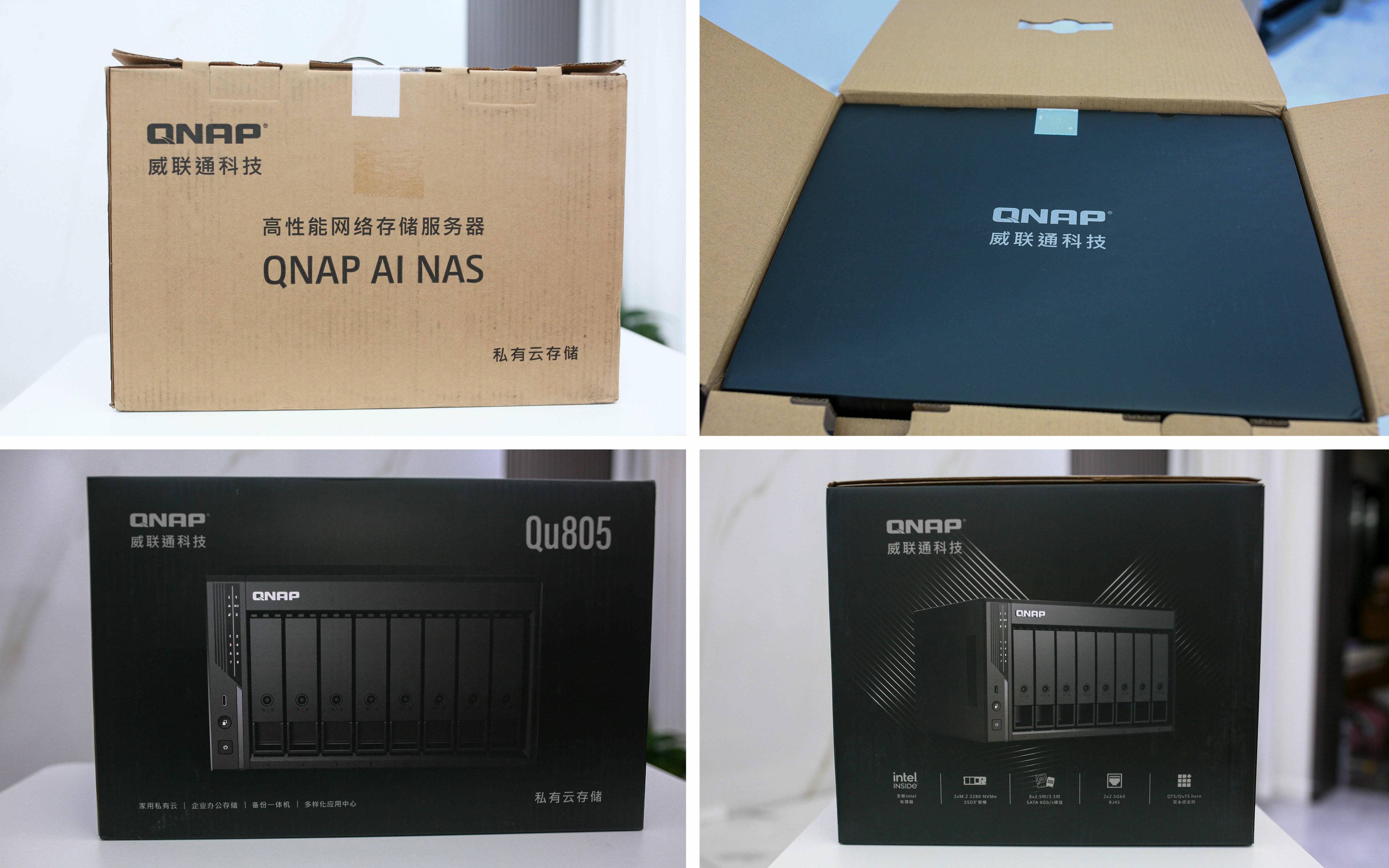这次 QNAP Qu805 的包装设计可以说是诚意满满。外部采用坚固的牛皮纸包装,既环保又耐用,内部则使用黑色精装盒,质感更上一层楼。两层保护结构在运输中能有效防止磕碰,开箱仪式感也更强。