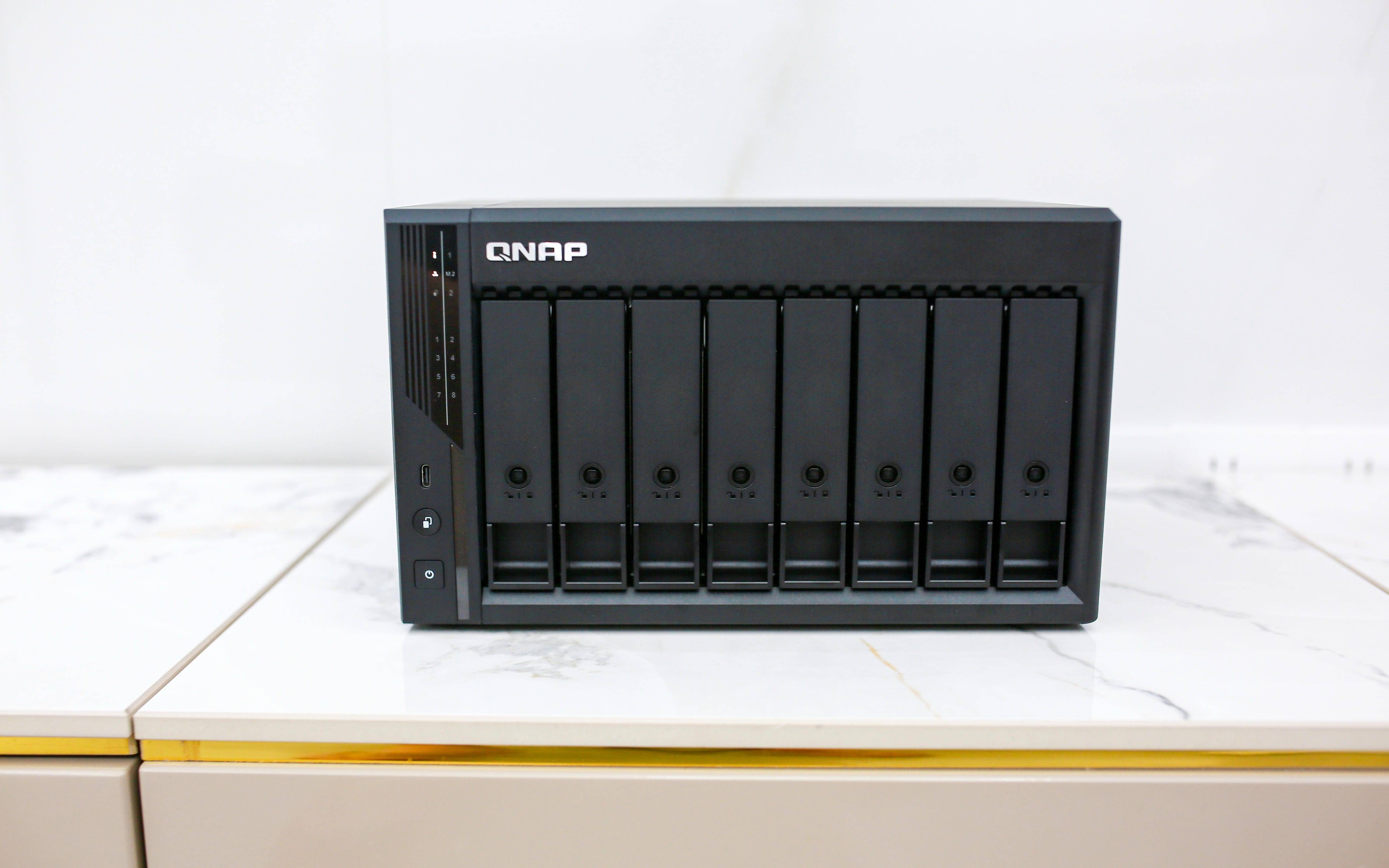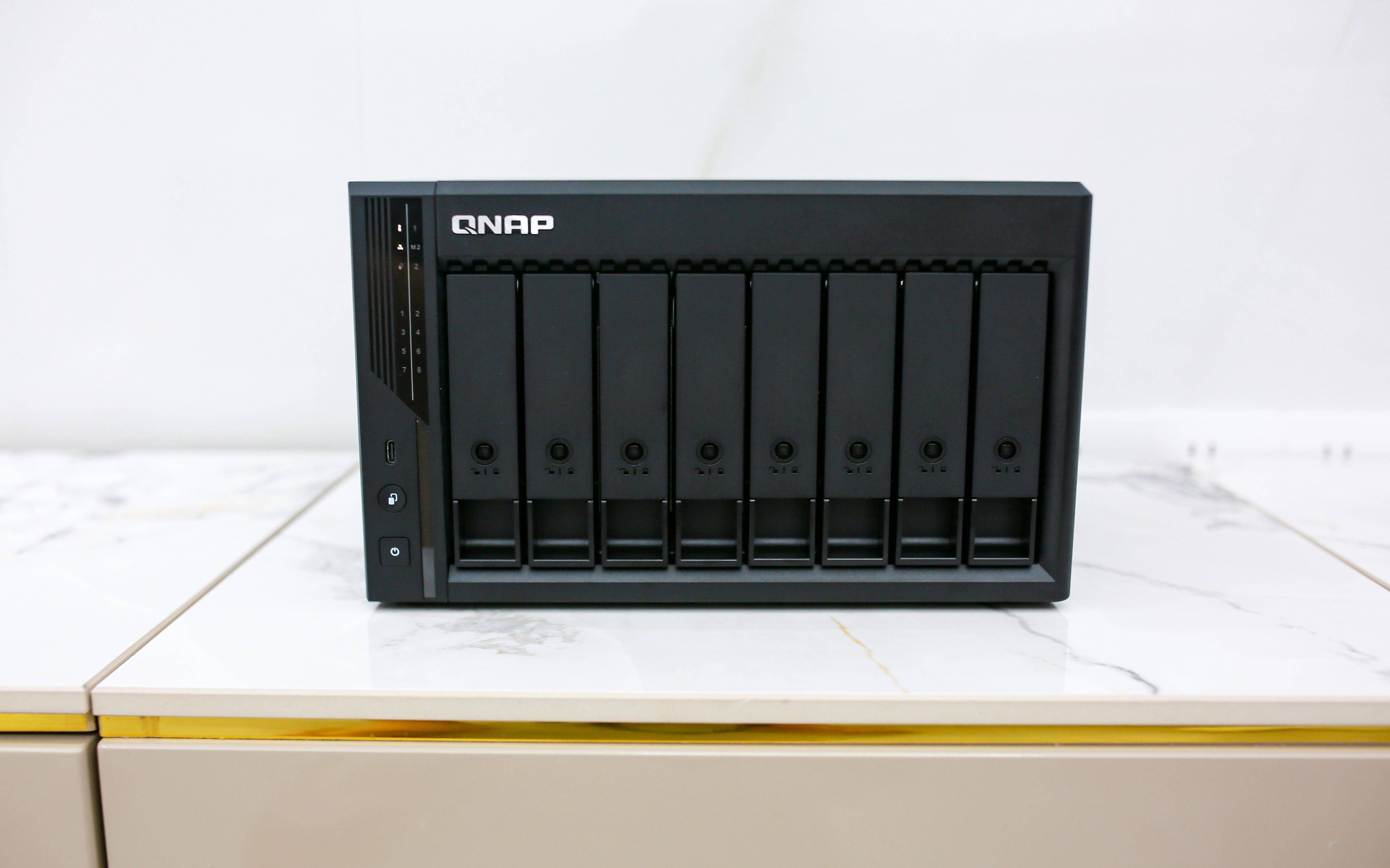 威联通在 2025 年 9 月丢下重磅炸弹——Qu805。8 盘位 + 双 M.2 + Intel i3-N355,再配上 3799 元 的亲民价,几乎把“堆料”和“性价比”写在了机身上。它标配 16GB DDR5,最高可扩展至 256TB,既能装下整套 4K/杜比影音库,也能胜任小团队的多用户协作与权限管理。接口同样齐全:双 2.5GbE(可链路聚合)、HDMI 2.1(4K 输出) 与 USB 10Gbps,从客厅直连播放到素材高速拷贝都能覆盖。
