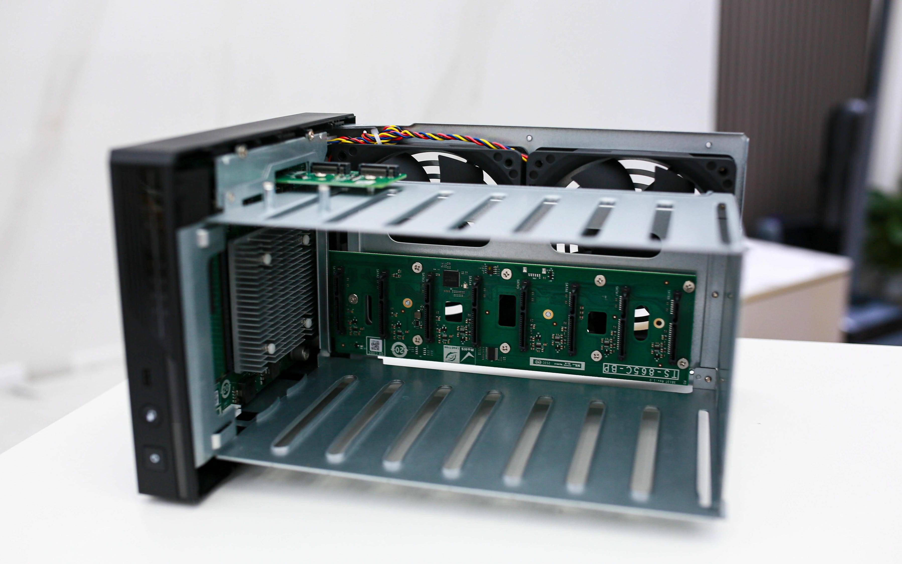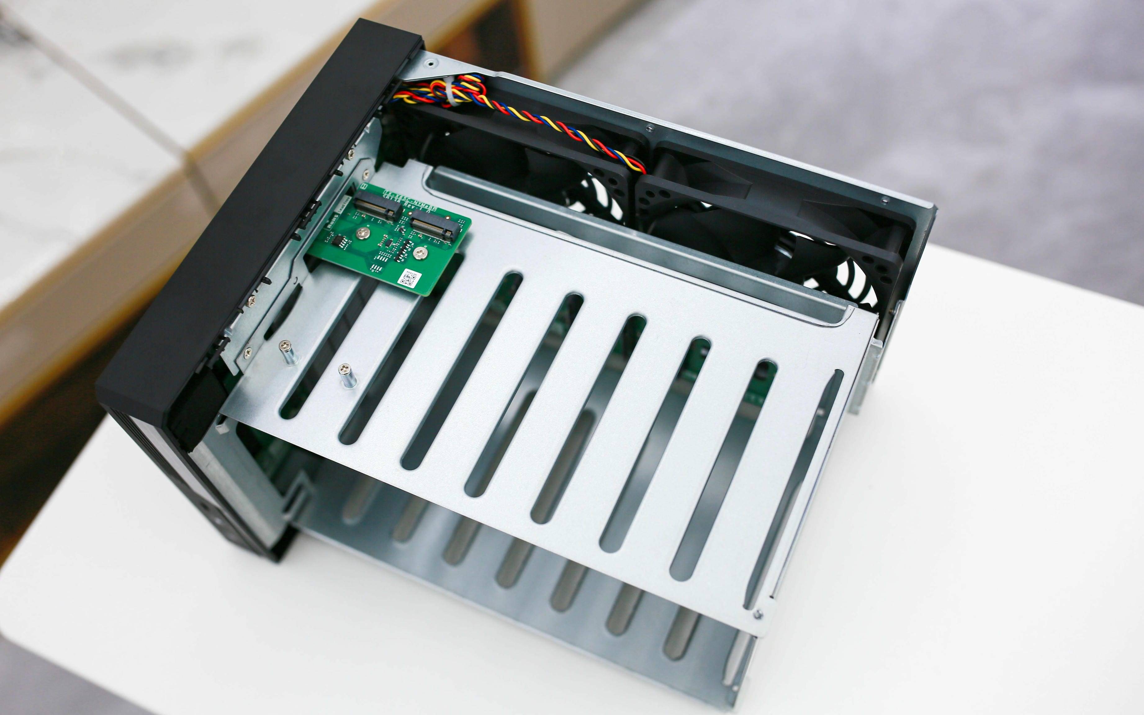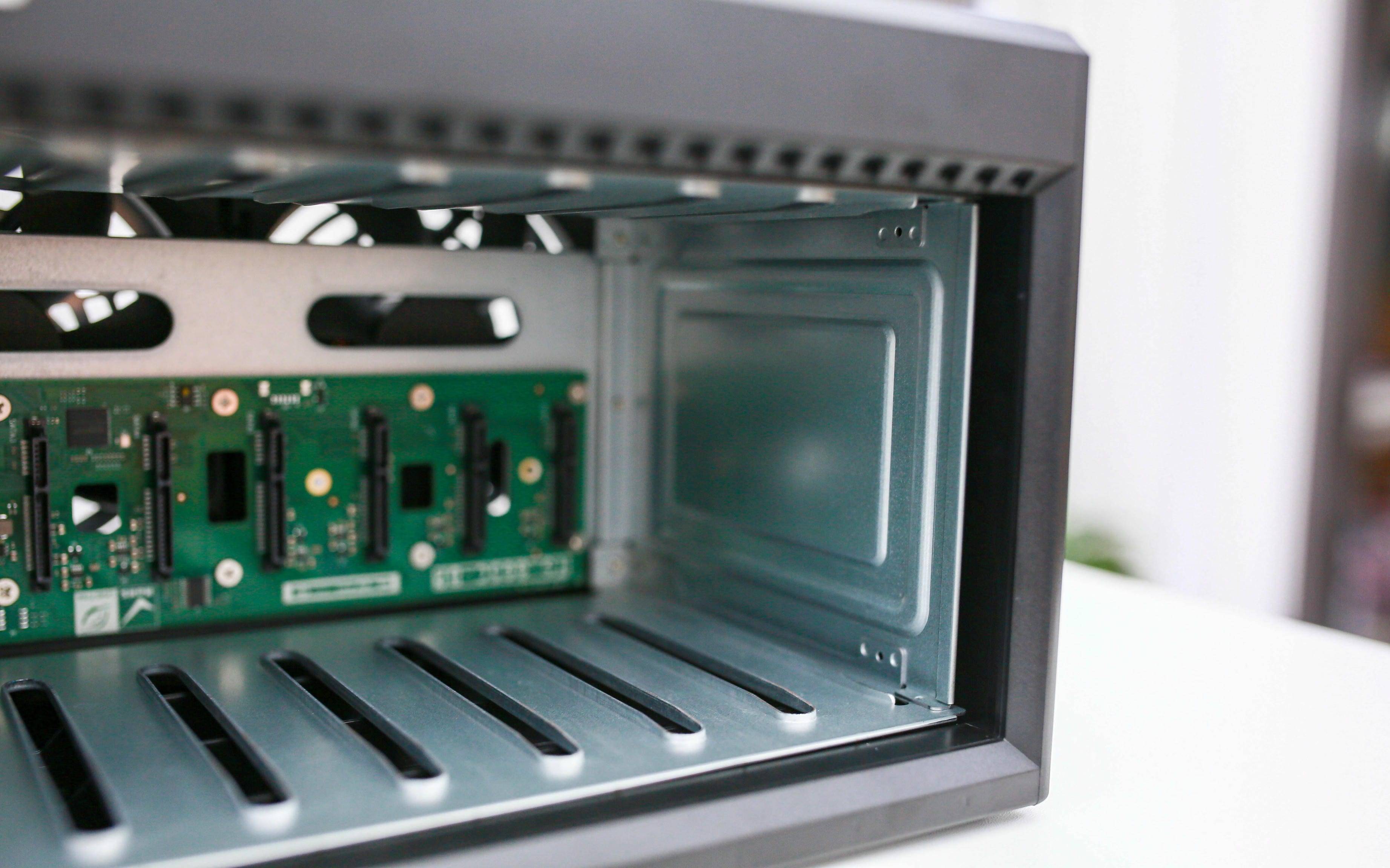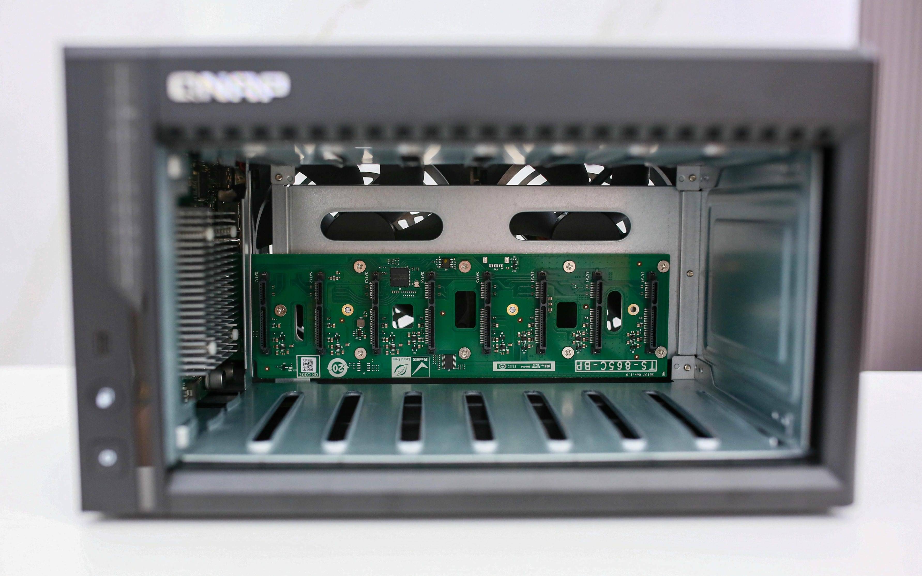 打开机身后,内部结构一览无余:主板、双 M.2 扩展插槽、SATA 背板以及两枚硕大的 静音调速风扇 构成了核心布局,剩余部分则是坚固的金属框架。威联通延续了其经典的防共振结构设计,多年验证的框架方案让硬盘运行更稳、更静音。无论是散热效率还是整体支撑性,都处于 NAS 行业的上乘水平。