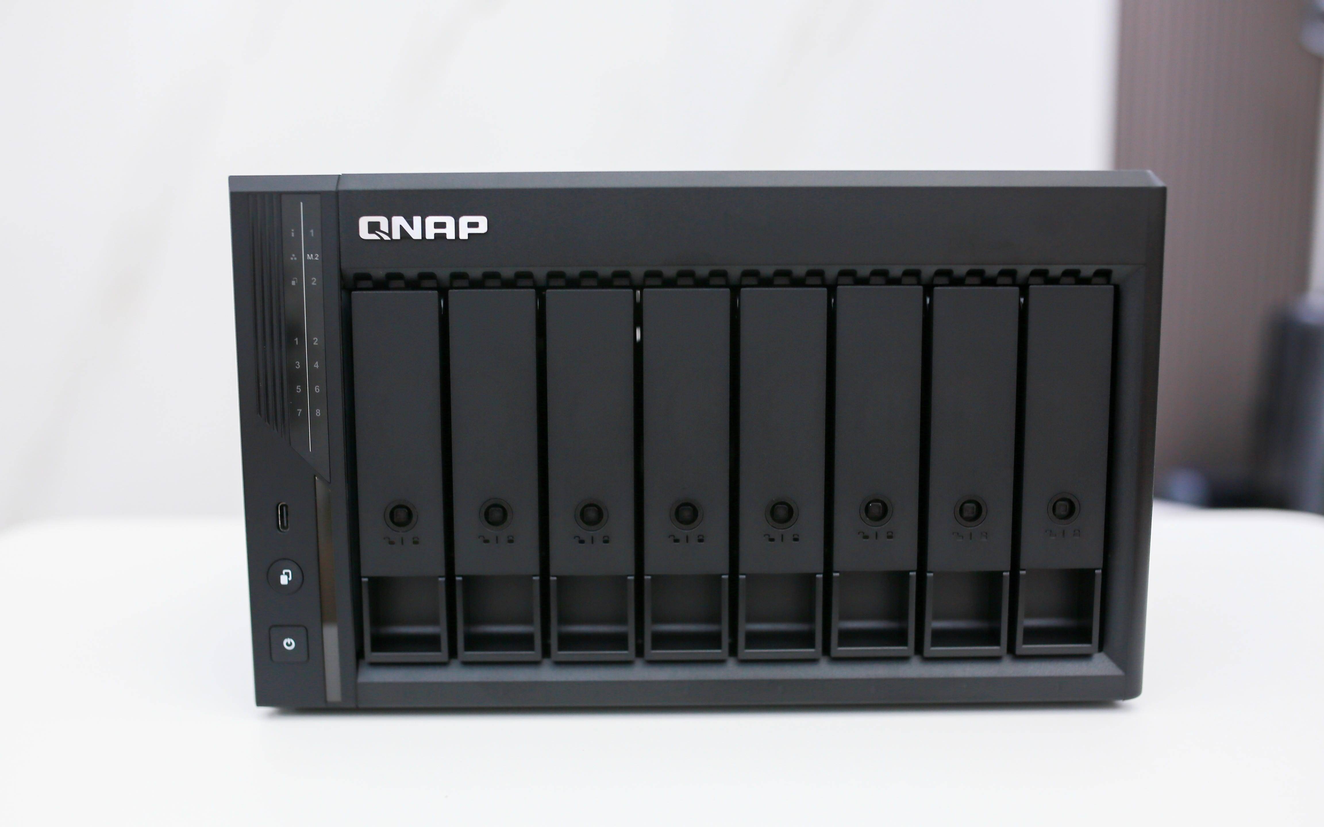 外观上,Qu805 延续了威联通一贯的专业简约风格,采用黑色磨砂外壳,造型方正稳重,整体尺寸仅 285×217×165mm,在 8 盘位 NAS 中属紧凑型。新设计的 双行 LED 指示灯 配合竖条纹装饰,更具层次感与科技氛围;而 8 个硬盘仓排列整齐,视觉秩序感极强,让“盘位焦虑”彻底消失,兼具实用与美观。