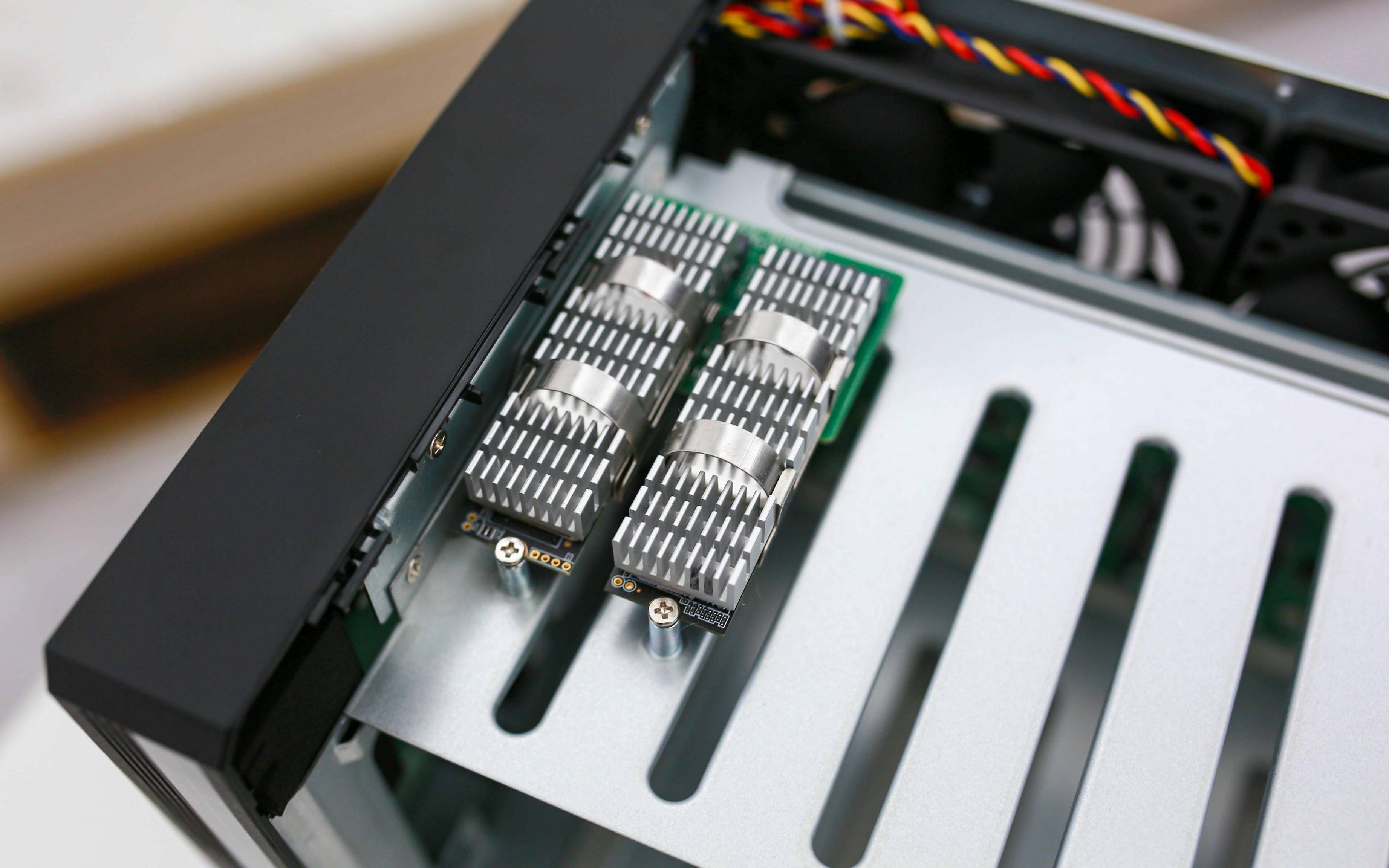 在硬盘笼上方,威联通为Qu805 预留了 两个 M.2 NVMe 2280 插槽,支持 SSD 作为缓存或高速存储使用。双M.2盘位也是通过扩展卡的形式从左侧主板延伸出来,支持PCIe 3.0x1,单盘最大支持4TB。