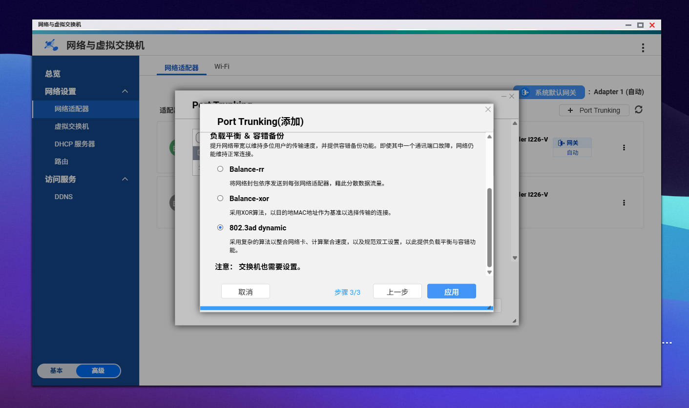 如果你使用的是交换机没有LACP,推荐选择 Balance-rr(bond0)模式,这种模式能实现带宽分流与负载均衡。而若交换机支持 LACP,则可选择对应动态聚合模式,进一步提升链路冗余与可靠性。正确配置后,NAS 的网络带宽将被充分释放,实现更高效的数据吞吐与多任务并发能力。