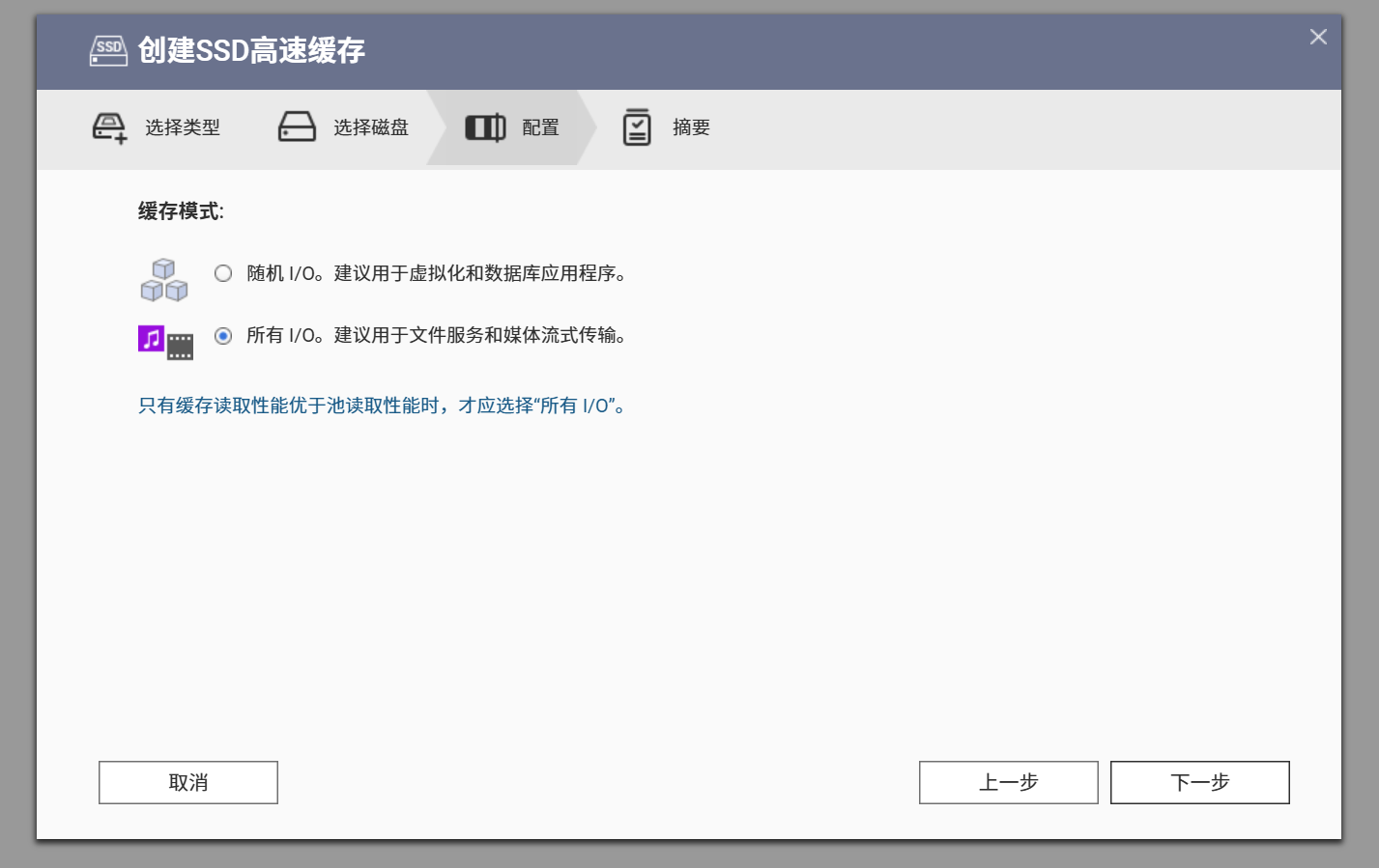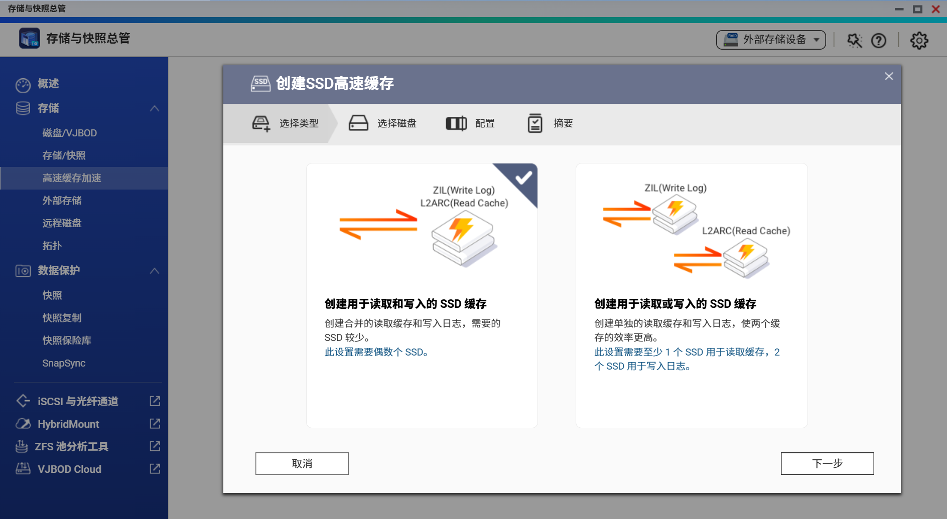 在 QuTS Hero 系统中,高速缓存(Cache Acceleration)是提升整体性能的核心技术之一。它利用 SSD 缓存加速机制,在传统机械硬盘阵列(HDD RAID)与系统间建立“中间层”,通过高速的读写缓存来显著优化 I/O 性能。尤其是在面对大量小文件读写或频繁访问的数据场景时,缓存能有效减少磁盘寻址延迟,使系统响应更快、访问更顺畅。