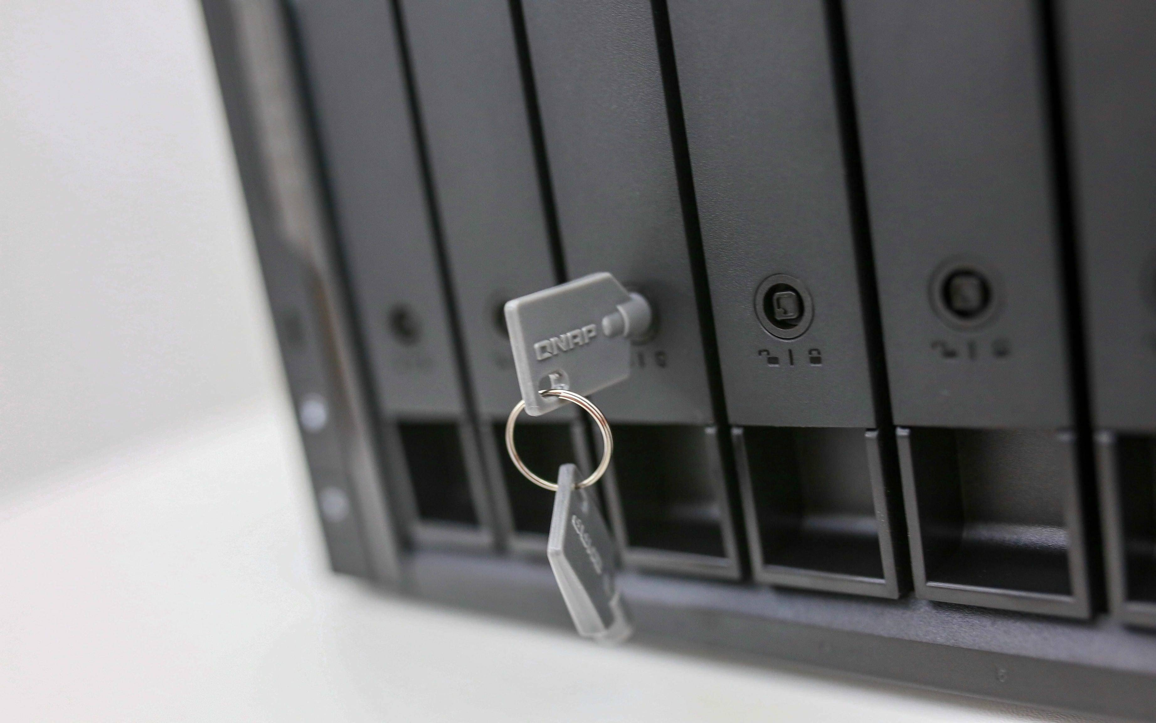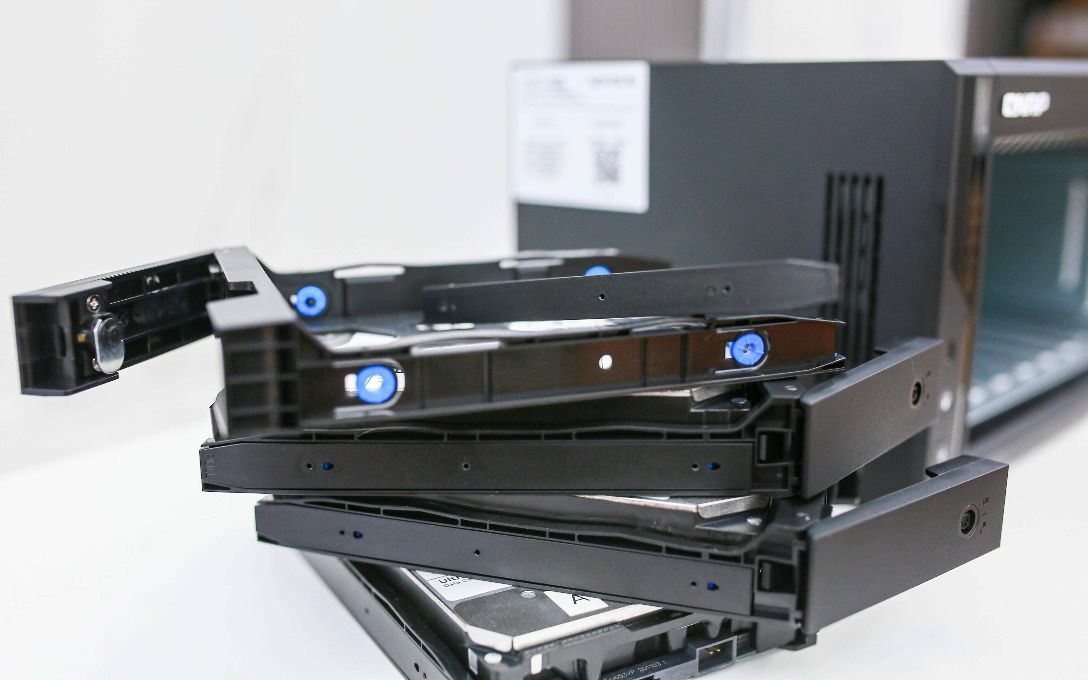 这里特别提醒一句,家里有小朋友或养猫的用户一定要锁好硬盘仓。威联通贴心地在每个托盘上都配备了专用锁扣设计,可以有效防止孩子或宠物误触拔盘,保障数据安全与设备稳定运行,这一点在多盘位 NAS 中尤为重要。
