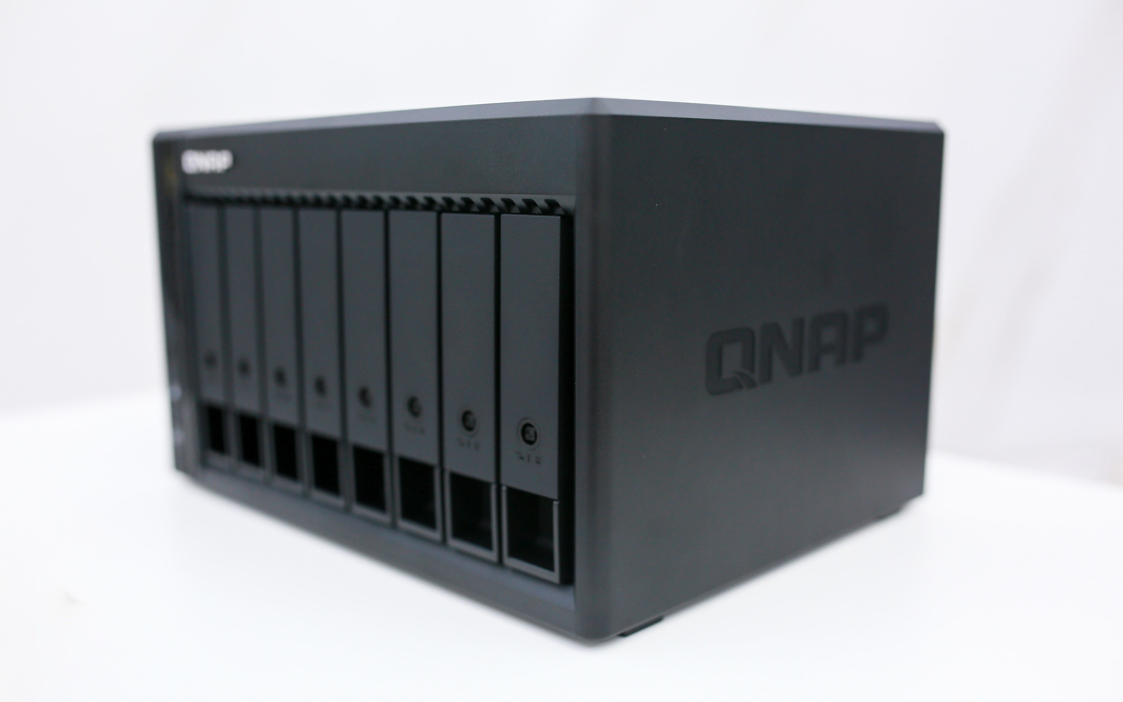 机身左侧布满了竖条状散热开孔,恰好对应主板区域,能在保持静音的同时形成高效进风路径,确保主板长时间运行依旧稳定。而右侧的 QNAP 压模 LOGO 则成为点睛之笔,金属质感细腻,在光线下泛出柔和光泽,不仅提升了品牌辨识度,也让整机在工业设计上更具高级感与精致度。