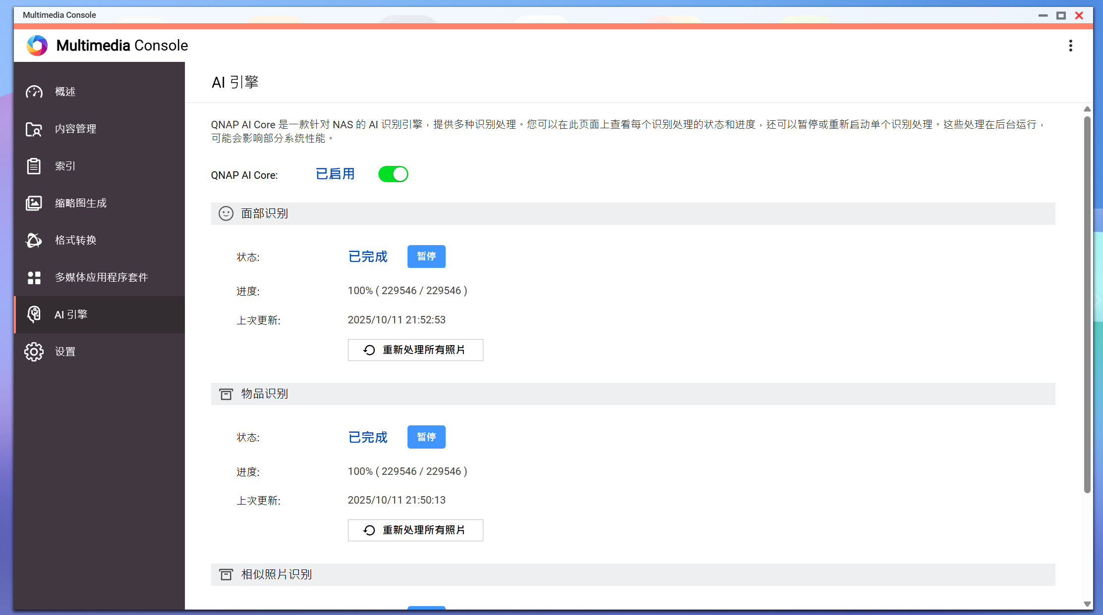 在威联通 NAS 上,Multimedia Console 可谓是多媒体资源管理的核心中枢。它将索引生成、缩略图创建、面部与物品识别、相似照片比对、格式转换 等功能集中在同一界面中统一管理,并能直接调用QNAP AI Core 引擎 进行智能识别与加速处理。用户无需再分别打开多个软件,即可完成所有媒体内容的分类、识别与优化,实现真正的一站式多媒体智能管理。