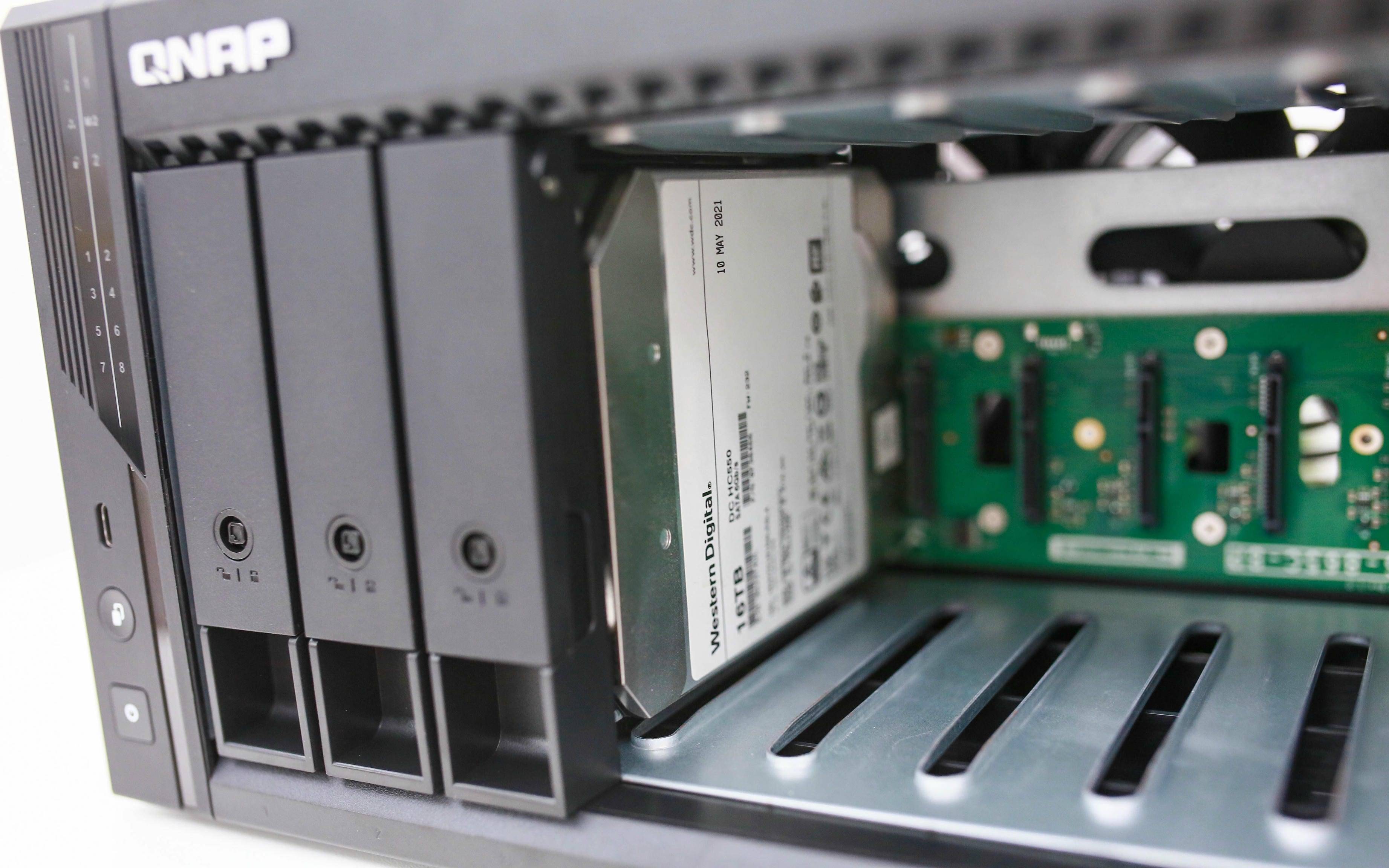 8 个 SATA 接口通过 PCIe 扩展板 从主板转接,背板芯片采用 ASM1166 控制器。该方案以高稳定性、低功耗著称,不仅性能可靠,还能有效降低长时间运行的发热。背板上密集排列的元器件与规整焊点,充分体现出威联通在用料与工艺上的扎实底蕴。对比那些成本压缩的三方小厂产品,这样的配置更能保障数据安全与硬盘寿命。