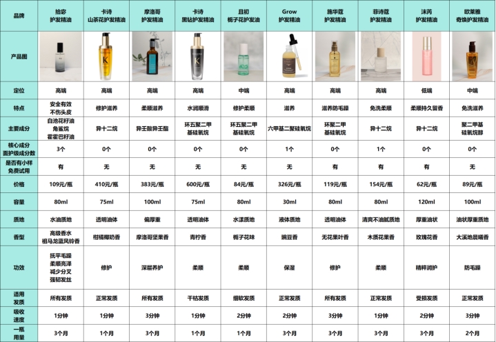 下面是几款护发精油的详细数据: