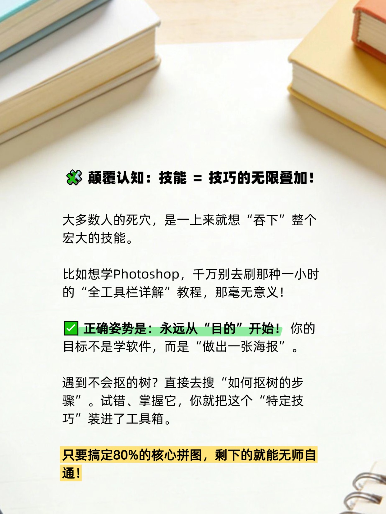 打工人想要快速提升,请立刻把这两句话刻在脑子里:1️⃣ 放弃“系统性学习”,只学能直接解决当下问题的“碎片技巧”,然后在实战中拼凑它们。