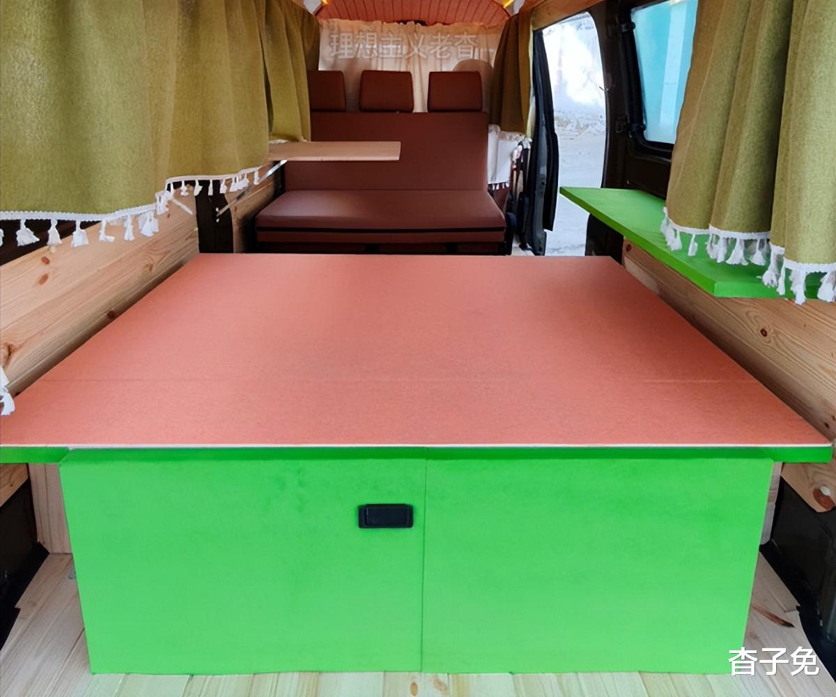 右侧是一张绿色长板,可以在上面学习办公,也可以放一些随手用品,尾箱下面都是储物空间,可打造后置微厨,上面是半个床板,非常的平整。