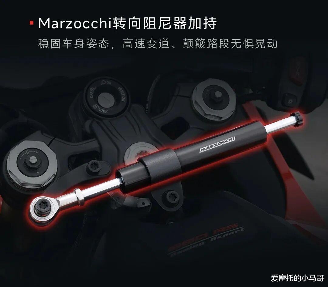 还加了Marzocchi的转向阻尼器,高速变道、颠簸路段骑行的时候,能有效稳固车身姿态,避免车头晃悠,高速骑行的稳定性提升很明显。
