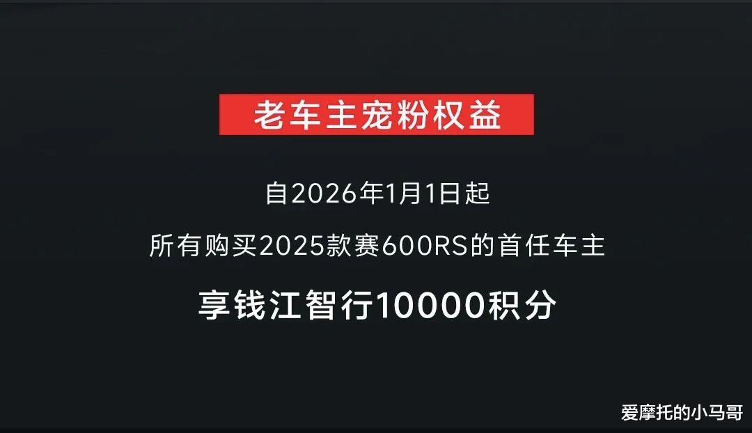还有老车主的宠粉权益,2026 年 1 月 1 日起,所有购买 2025 款赛 600RS 的首任车主,都能领到钱江智行 10000 积分,也算照顾了老车主的情绪,没搞纯纯的背刺操作。