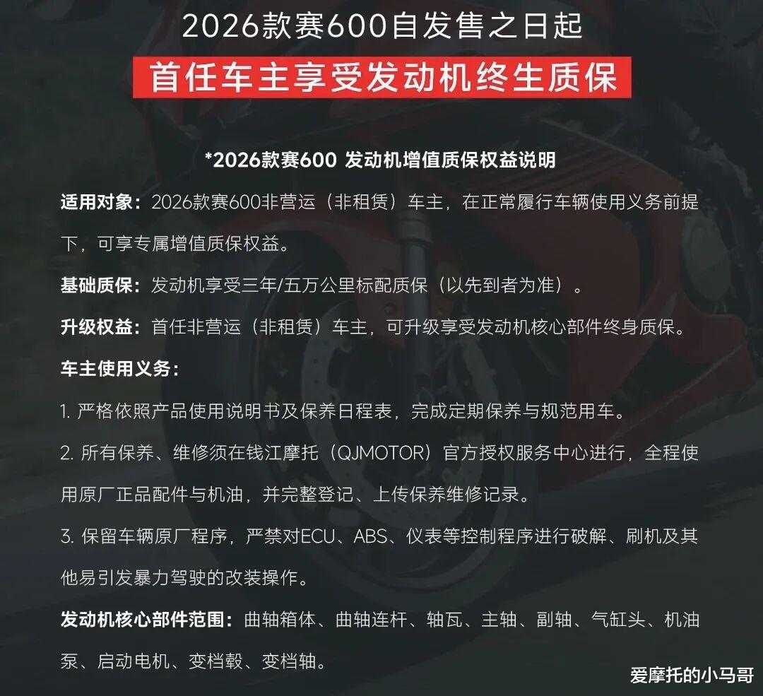 最重磅的是质保政策,2026 款赛 600 自发售之日起,首任非营运车主,能享受发动机核心部件终身质保。