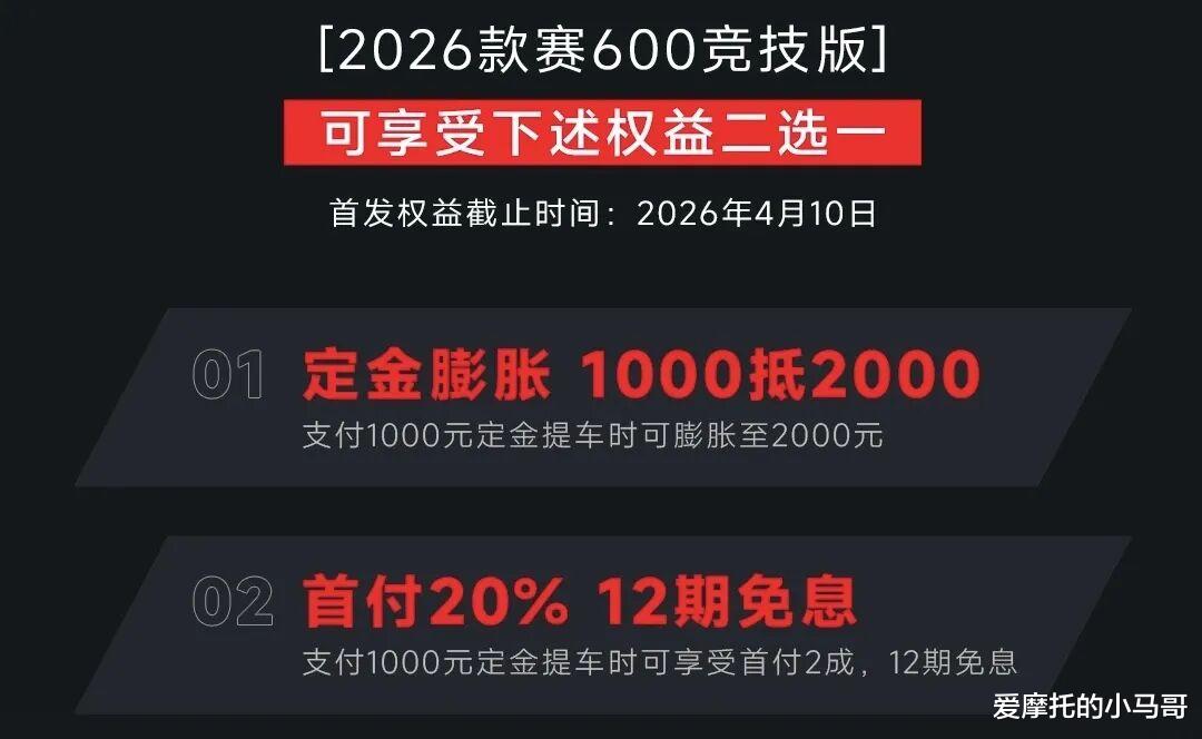 首先是竞技版的首发权益,截止到2026年4月10日,两个权益可以二选一:一个是定金1000抵2000,相当于提车再省1000块;另一个是首付20%,还能享 12 期免息,预算有限的车友也能零压力提车。