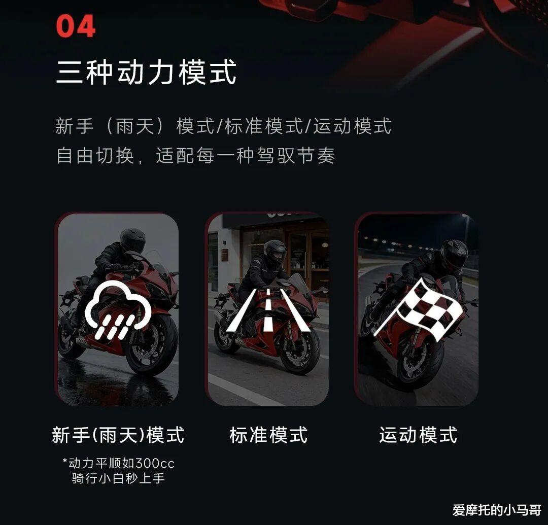 还有全系标配的三种动力模式,分别是新手(雨天)模式、标准模式、运动模式,能适配不同的骑行场景和技术水平。新手模式下,动力平顺得像 300cc 车型,就算是刚拿驾照的小白,也不会因为动力太冲慌神,上手门槛低了很多。