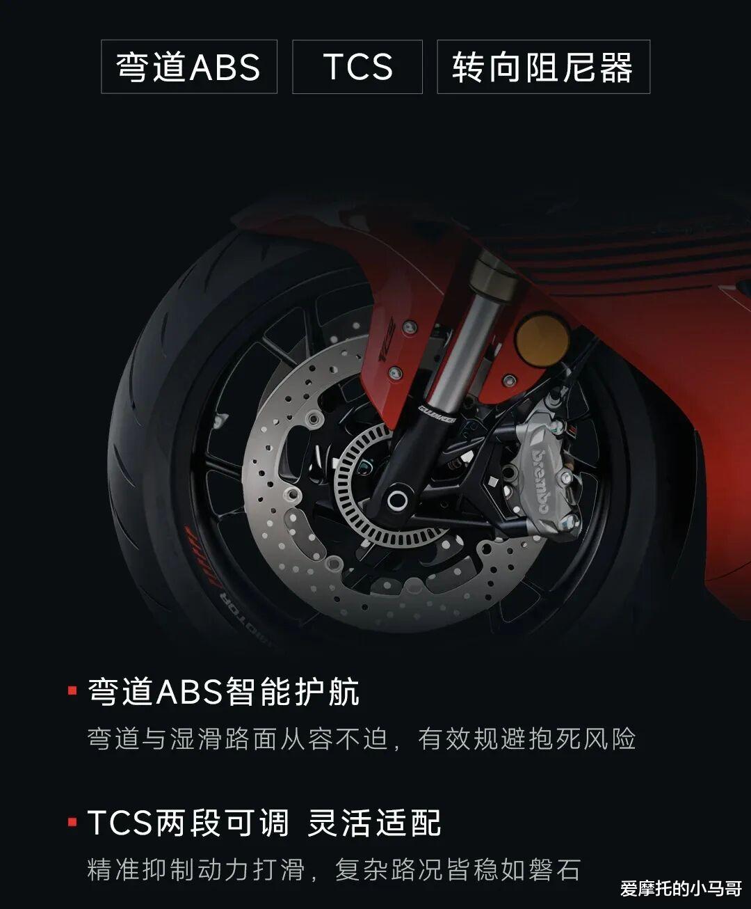 然后是竞技版的专属升级,首先是标配了弯道ABS,在弯道里刹车也能有效规避车轮抱死的风险,跑山过弯的时候,安全冗余高了不少,这也是同价位里很少给到的配置。
