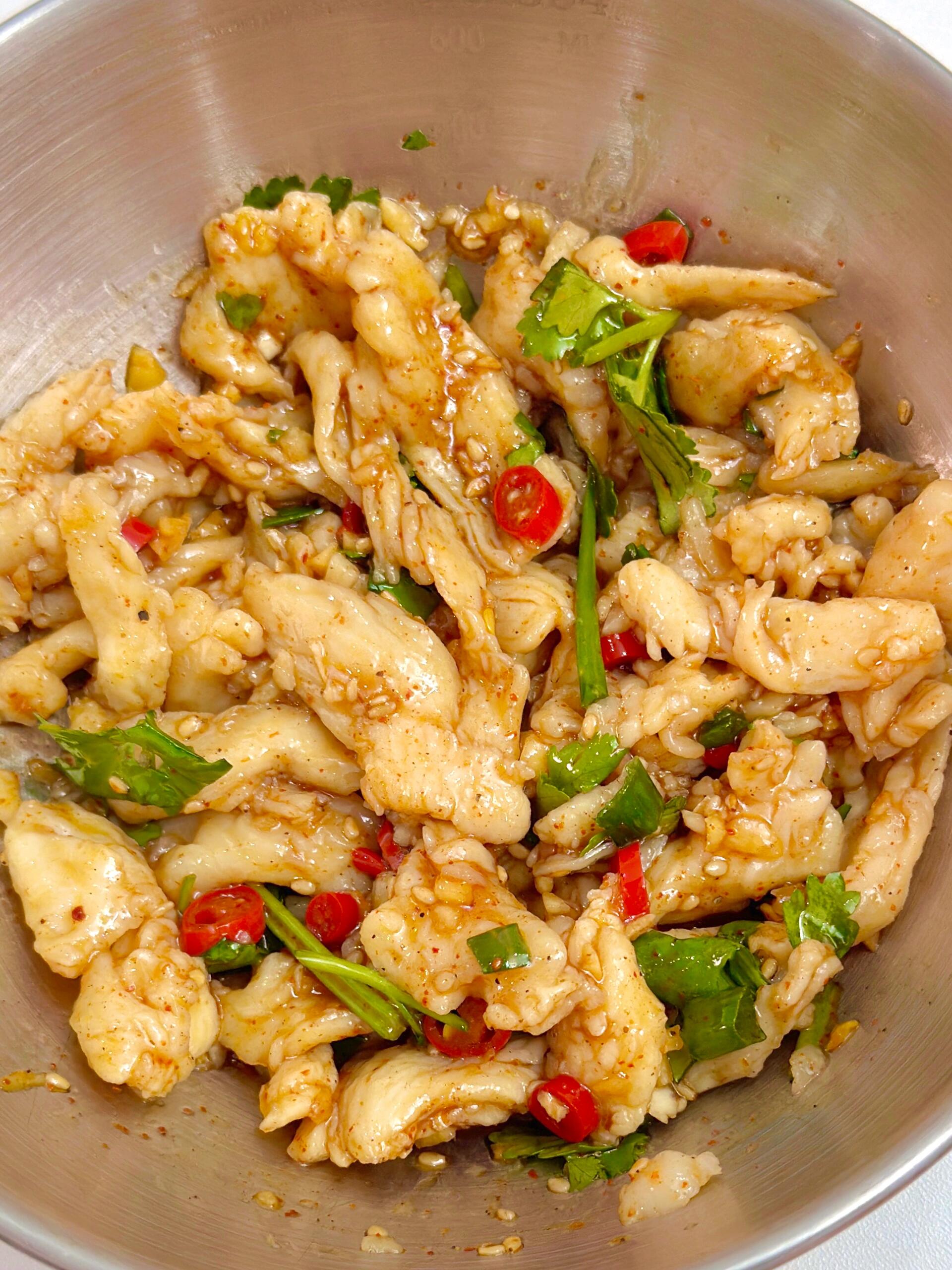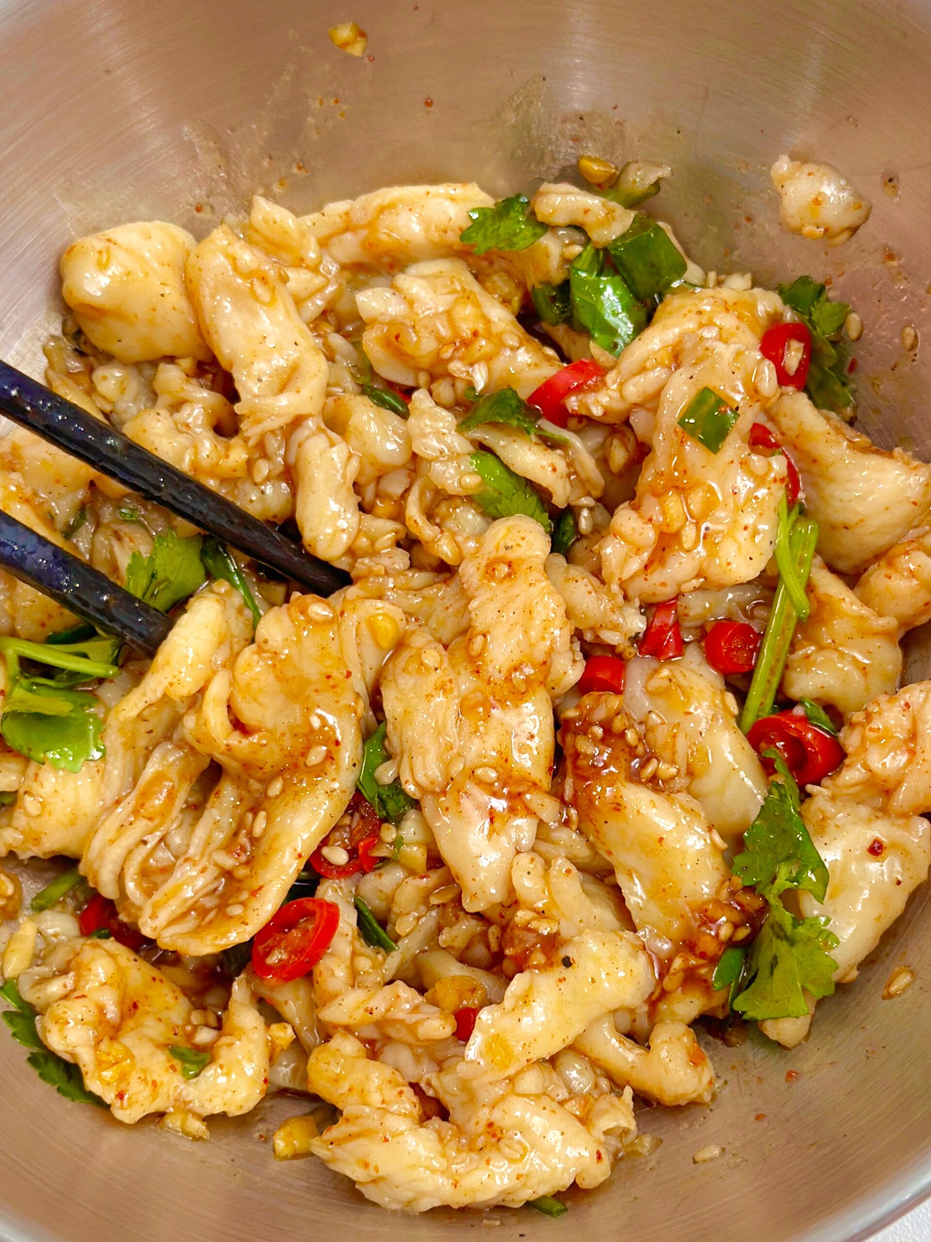 最后,将沥干水分的鸡胸肉片放入一个大碗中,撒上一些新鲜的香菜段,再把调好的酱汁全部淋在上面,用筷子充分翻拌,让每一片鸡肉都均匀地裹上浓郁的酱汁。此时,夹起一片放入口中,鸡肉的嫩滑和酱汁的酸辣在口腔中完美融合,口感丰富,层次分明,完全感觉不到鸡胸肉的干涩,只剩下满满的满足感。