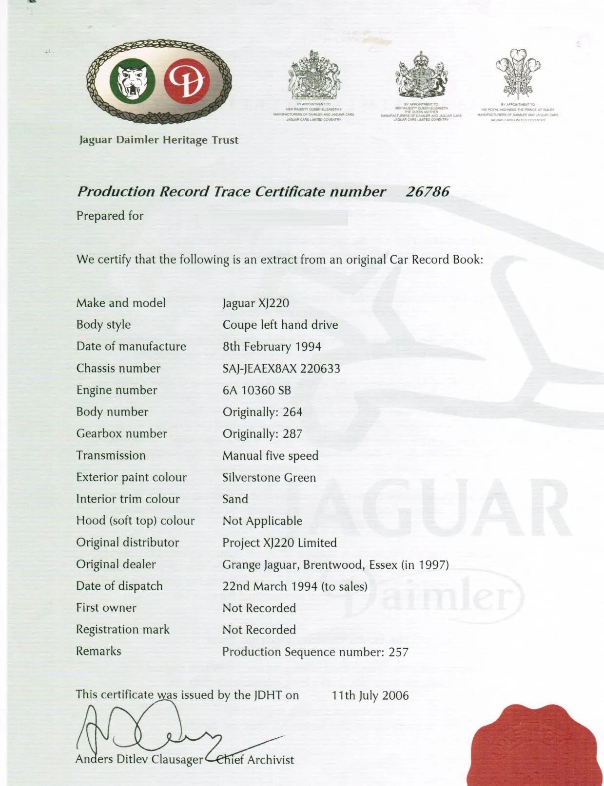 随车附带的捷豹戴姆勒遗产信托证书,清晰标注原厂颜色、部件编号、1994年3月从XJ220项目公司发运及1997年交付信息,搭配 Jaguar 原厂生产日期证明、历次所有权转移文件、车辆操作手册、工具包、急救包及全套保养发票,每一份文书都印证其收藏价值,Carfax报告更确认无任何事故及损伤记录,收藏安全性拉满。