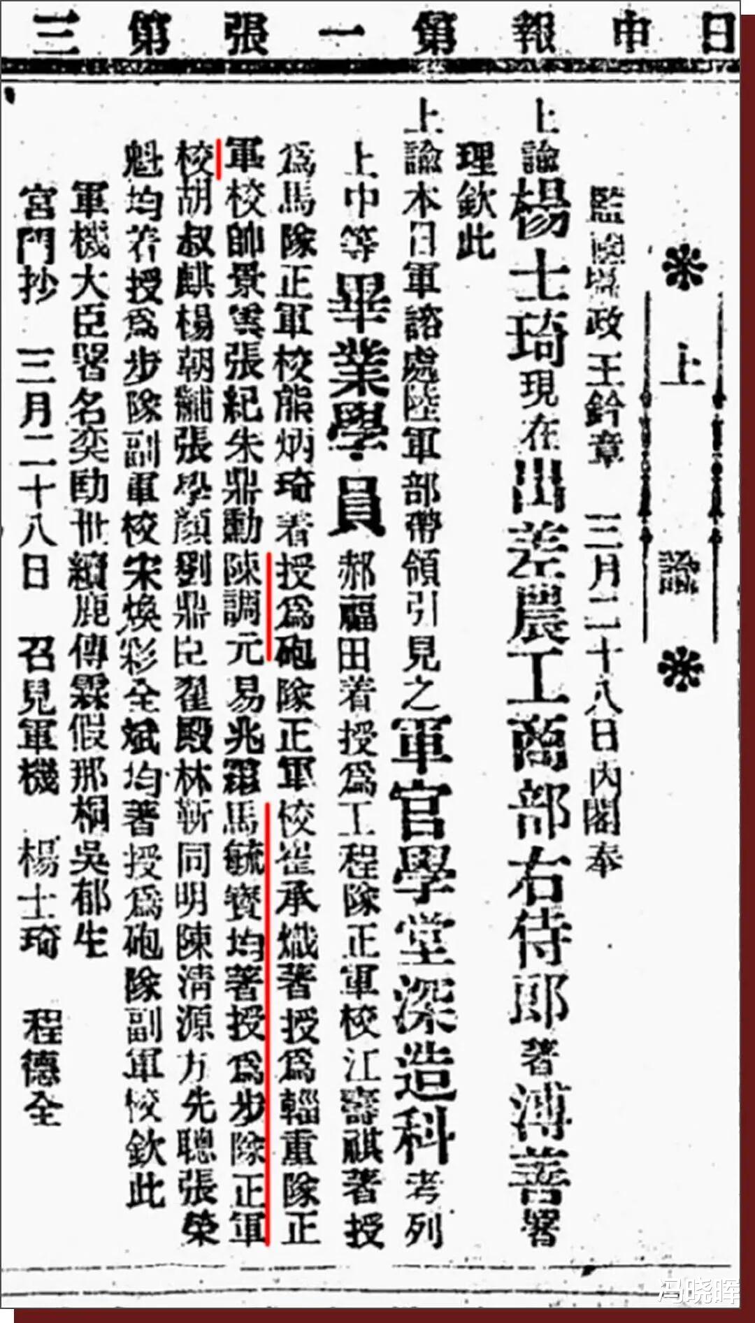 1910年,马毓宝被授予正军校官衔。清末新军仿照普鲁士军制建立了军阶等级,正军校为正五品,相当于原清军守备。请注意笔者另划出的一个名字,熟悉中国近代史的读者应该知道他是谁。